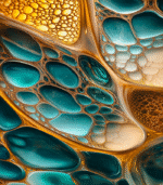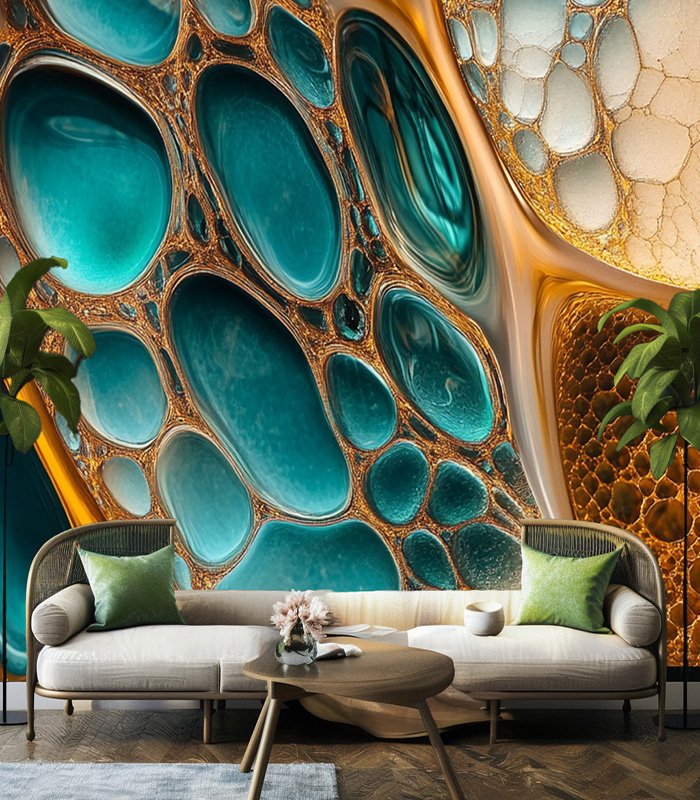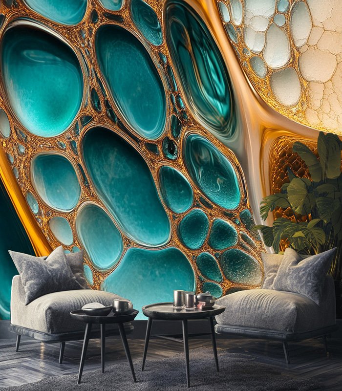 Abstract macro photography of fluid art, showcasing a mesmerizing blend of golden yellow and turquoise blue in intricate, bubble-like patterns.