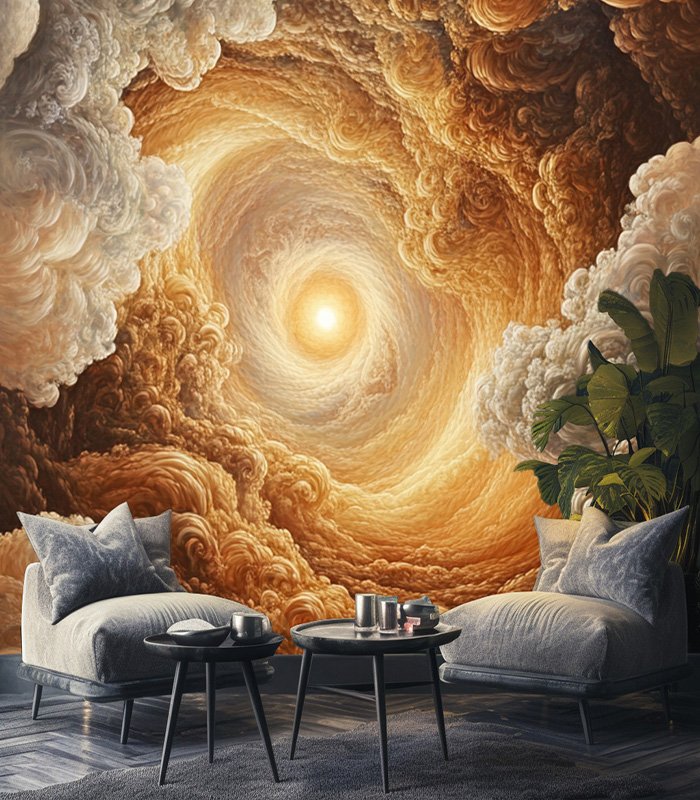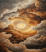 Swirling clouds form a dramatic vortex, with warm hues and a glowing center, creating a mesmerizing, celestial atmosphere reminiscent of a cosmic storm.