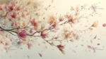 A delicate branch adorned with soft pink and white cherry blossoms, surrounded by falling petals.