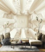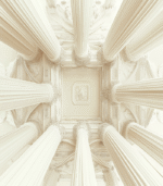 A stunning upward view of ornate classical columns and intricate ceiling details, showcasing architectural grandeur and elegance in a soft, monochromatic palette.