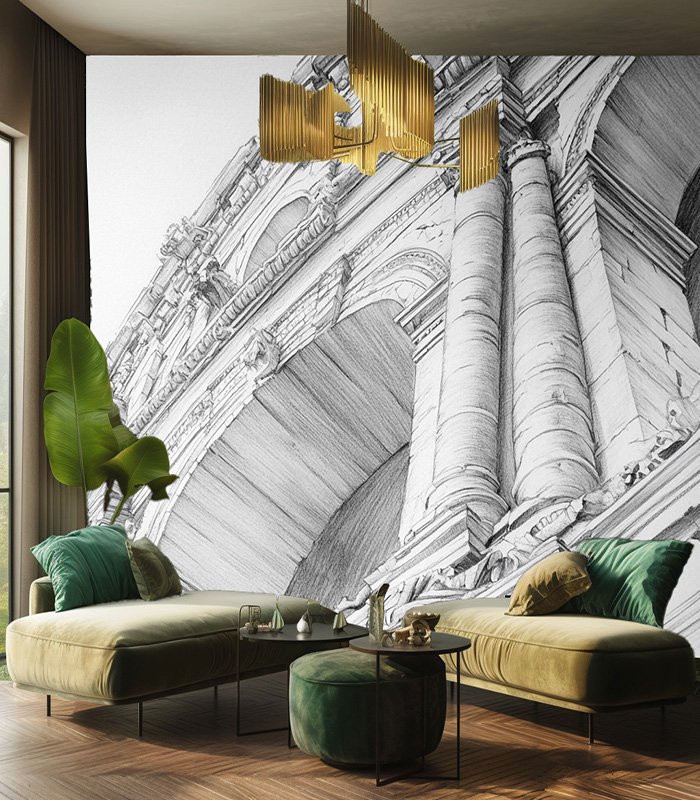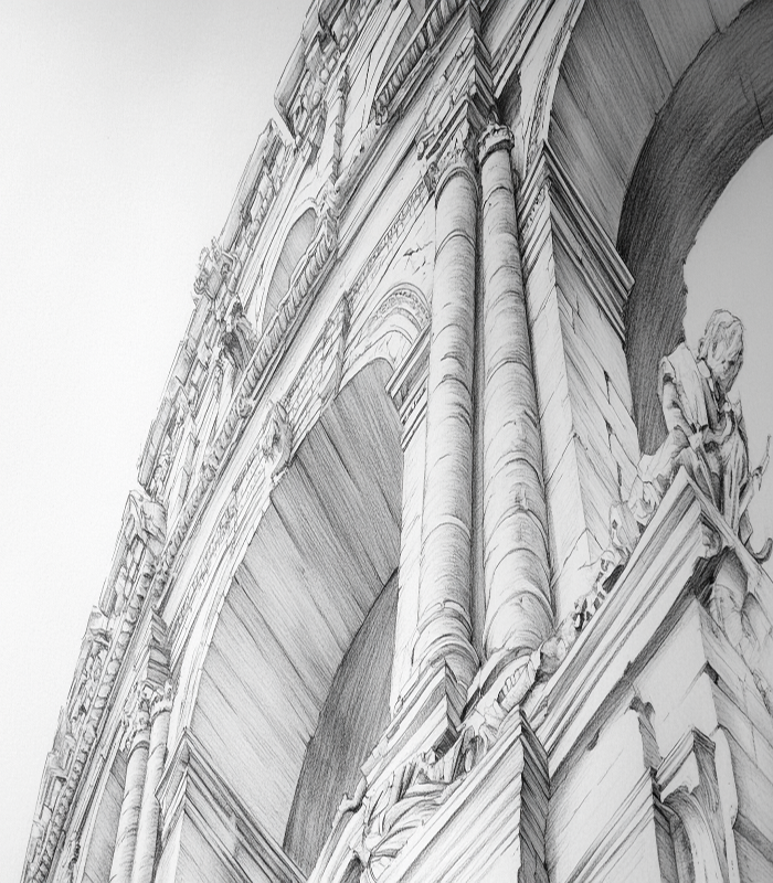 Intricate pencil sketch of a classical architectural facade, showcasing detailed columns and sculptures, capturing the grandeur and elegance of historical design.