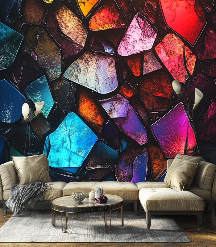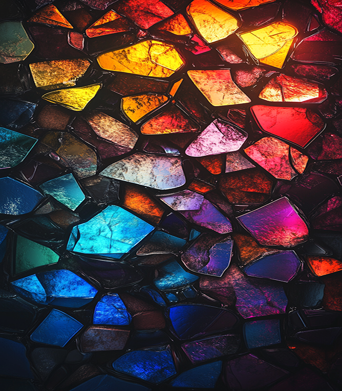 A vibrant mosaic of stained glass pieces in a myriad of colors, creating a visually captivating and textured abstract pattern.