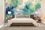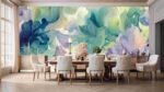 Soft, flowing shapes in shades of blue, green, and purple resembling flowers against a light background.