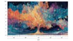 An artistic representation of a tree with vibrant orange, blue, and purple leaves against a dark background.