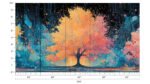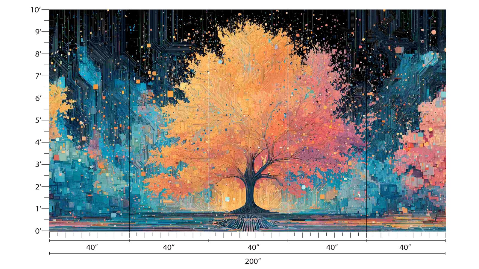 A vibrant tree with orange and pink leaves set against a dark, circuit-like background.