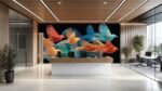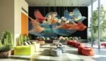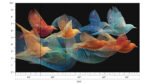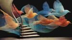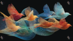 Stylized, colorful birds in flight with intricate, flowing lines on a dark background.