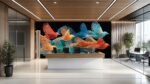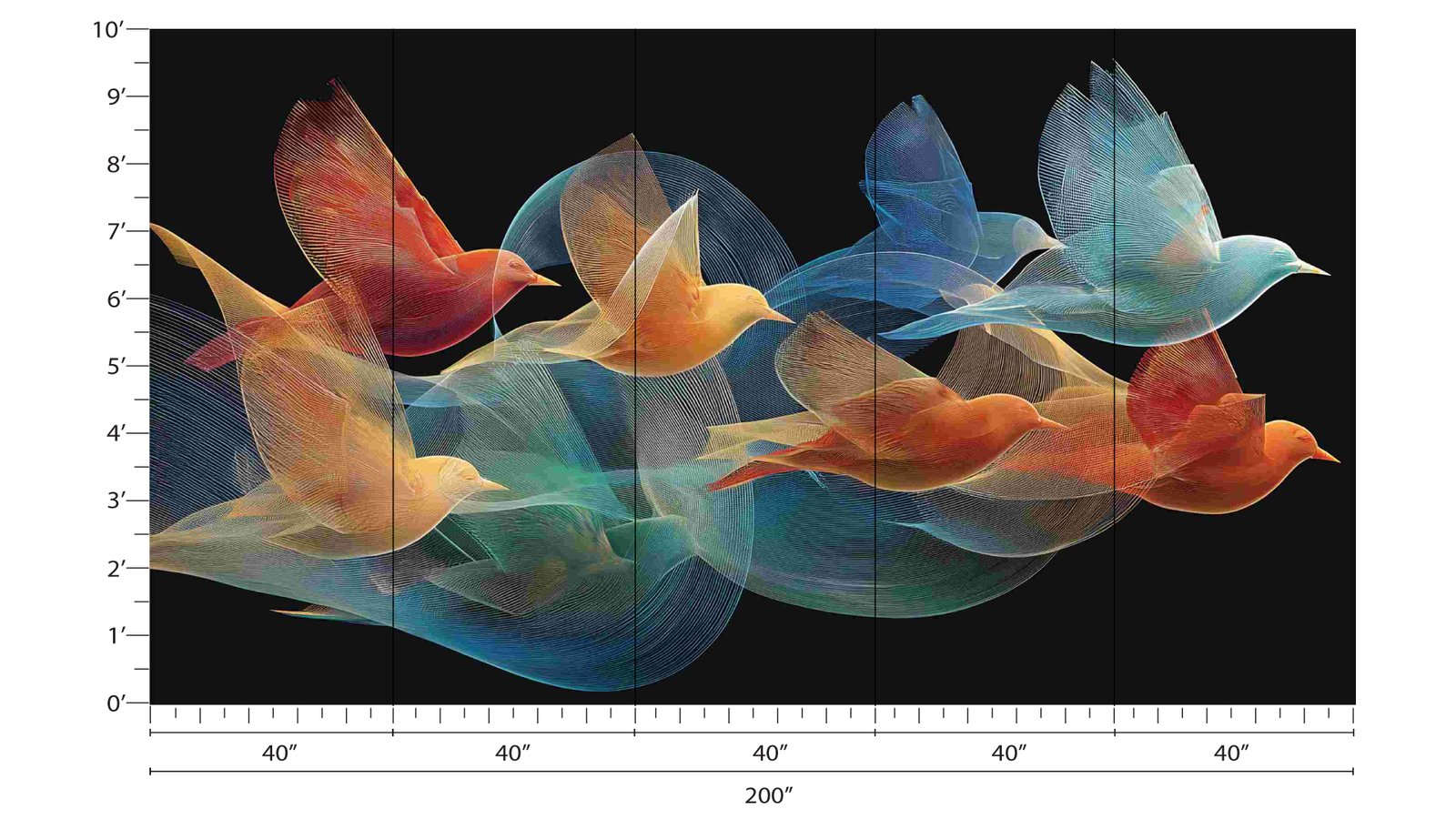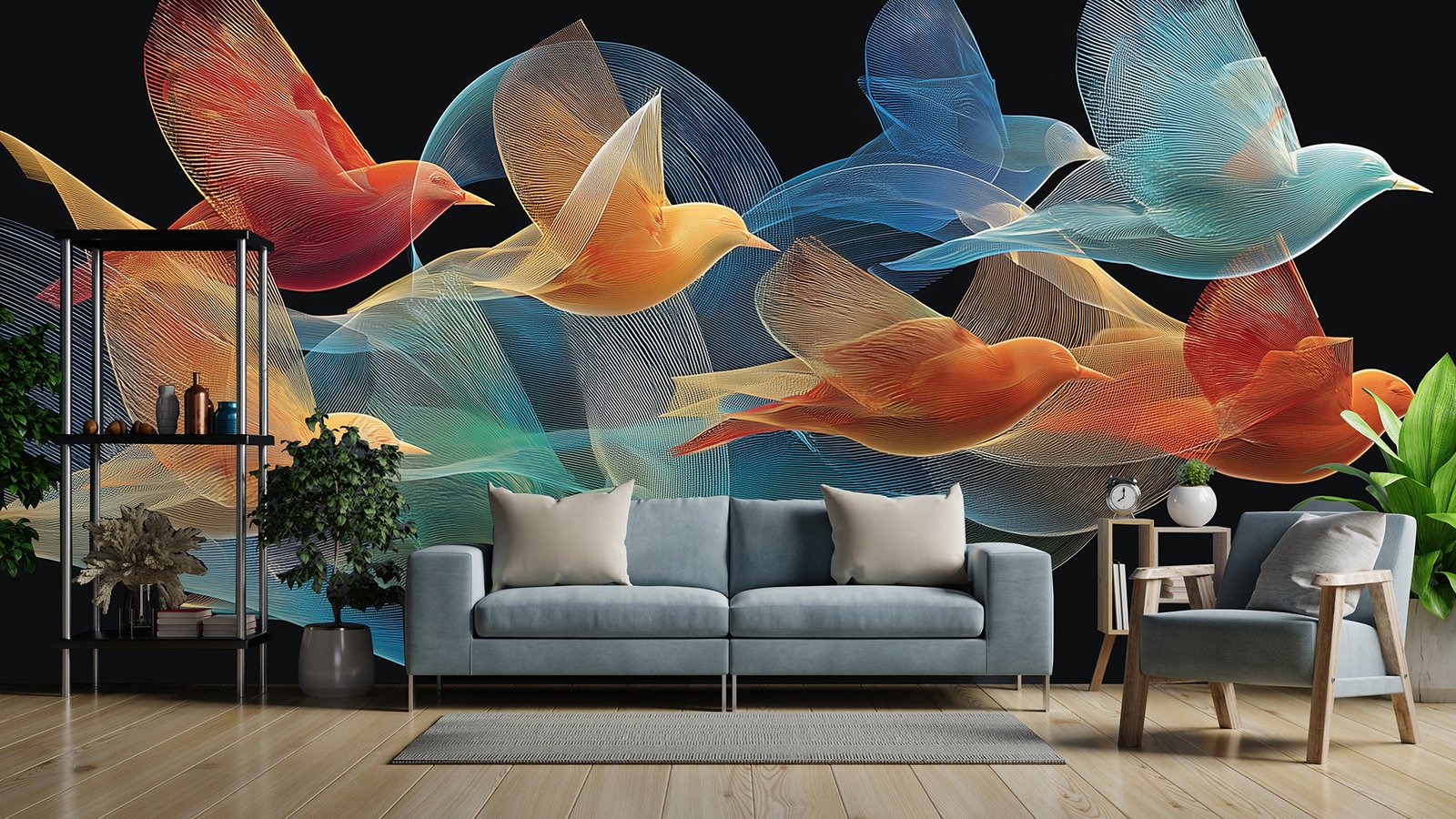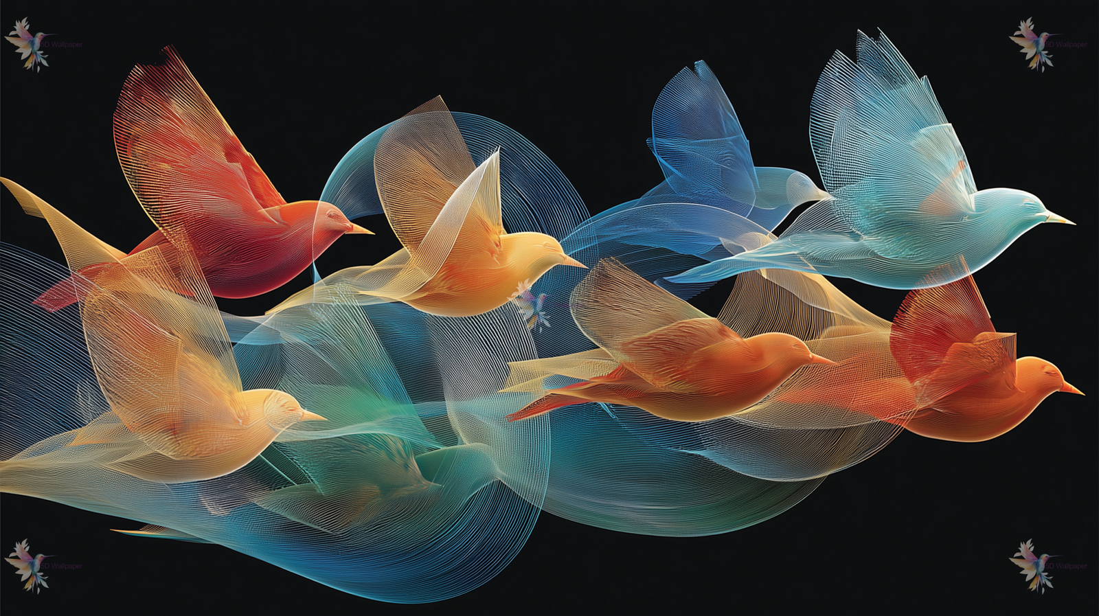 Stylized, colorful birds in flight with intricate, flowing lines on a dark background.