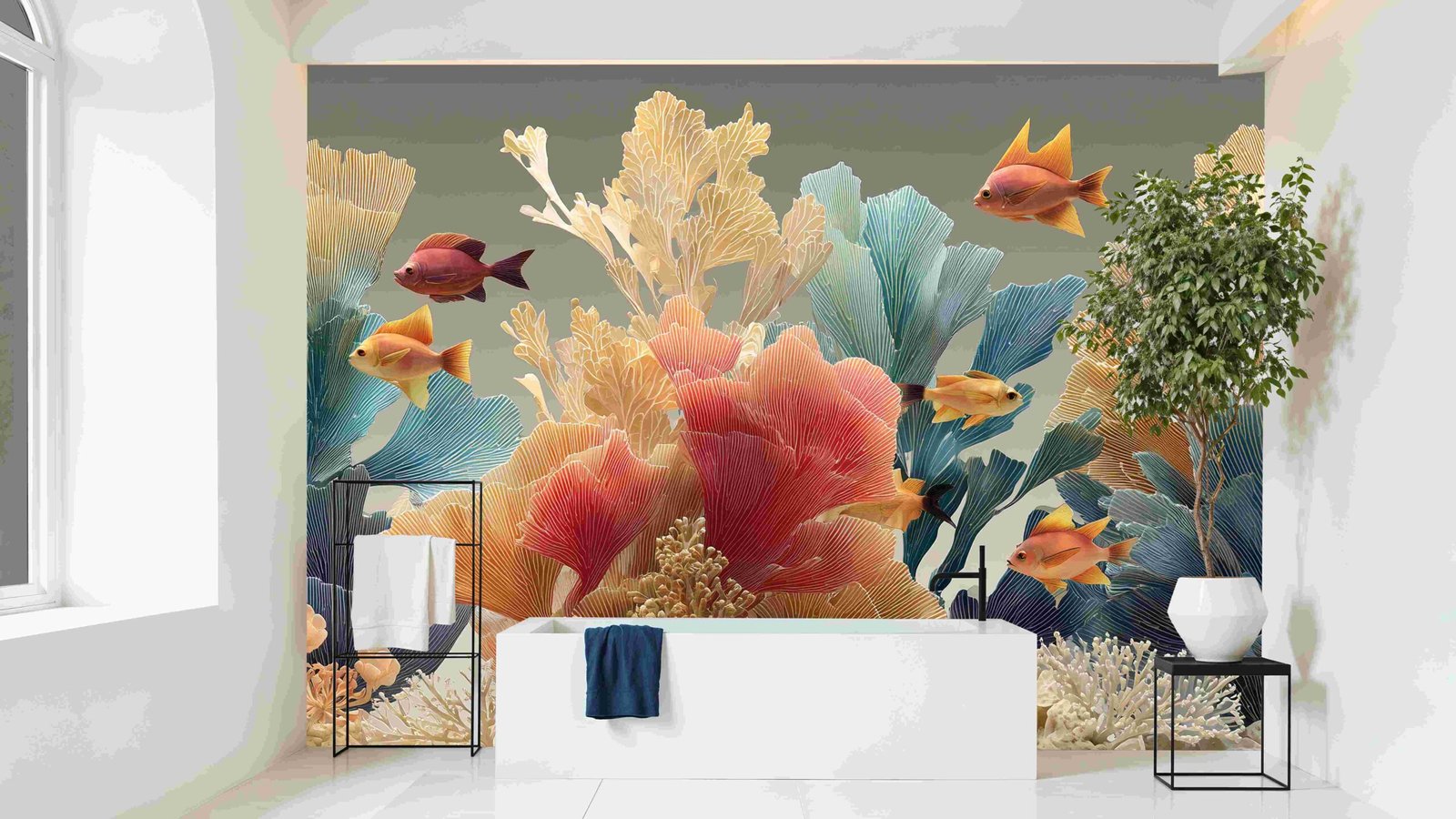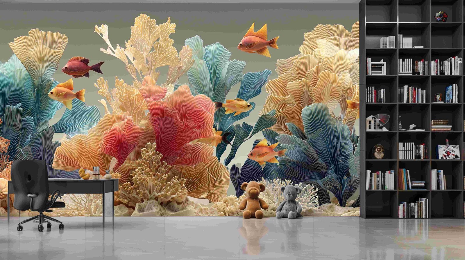 Vibrant coral formations with various fish swimming among them in a colorful underwater scene.