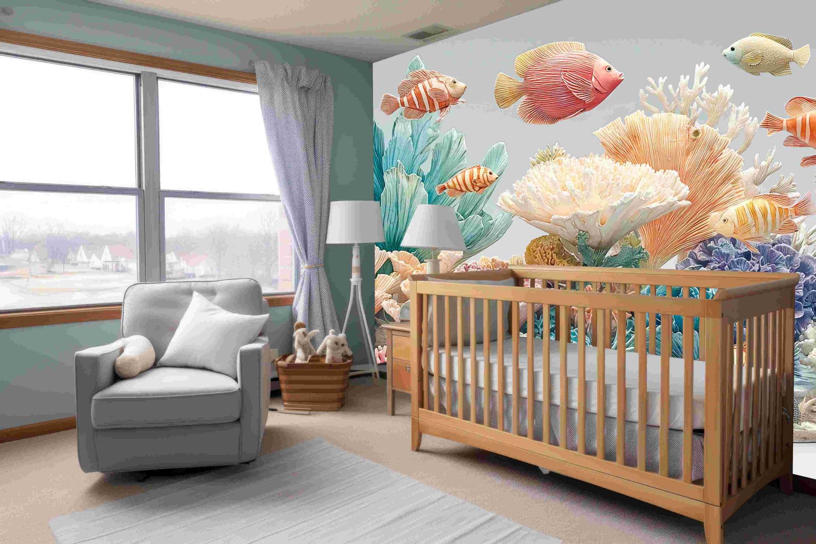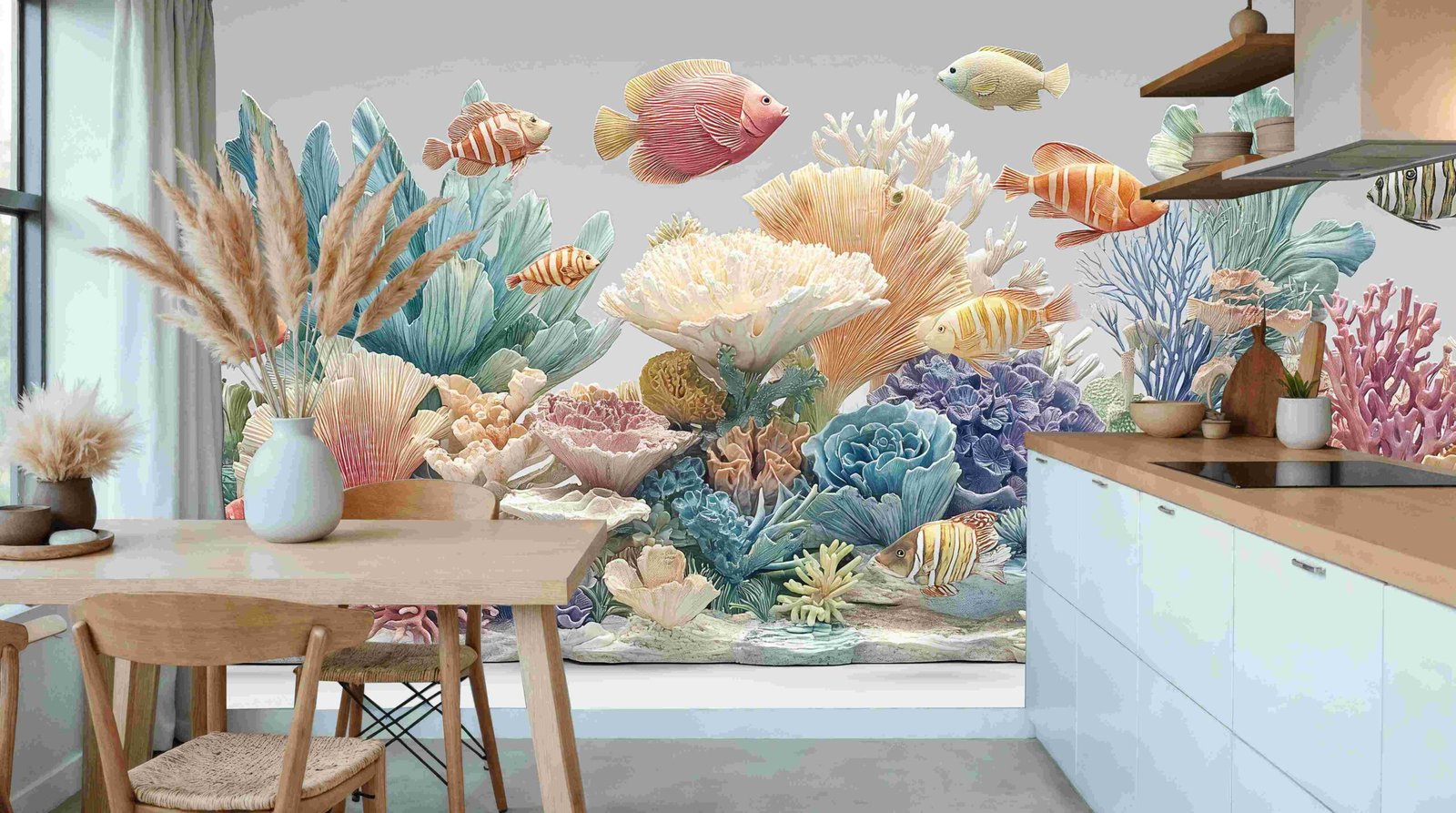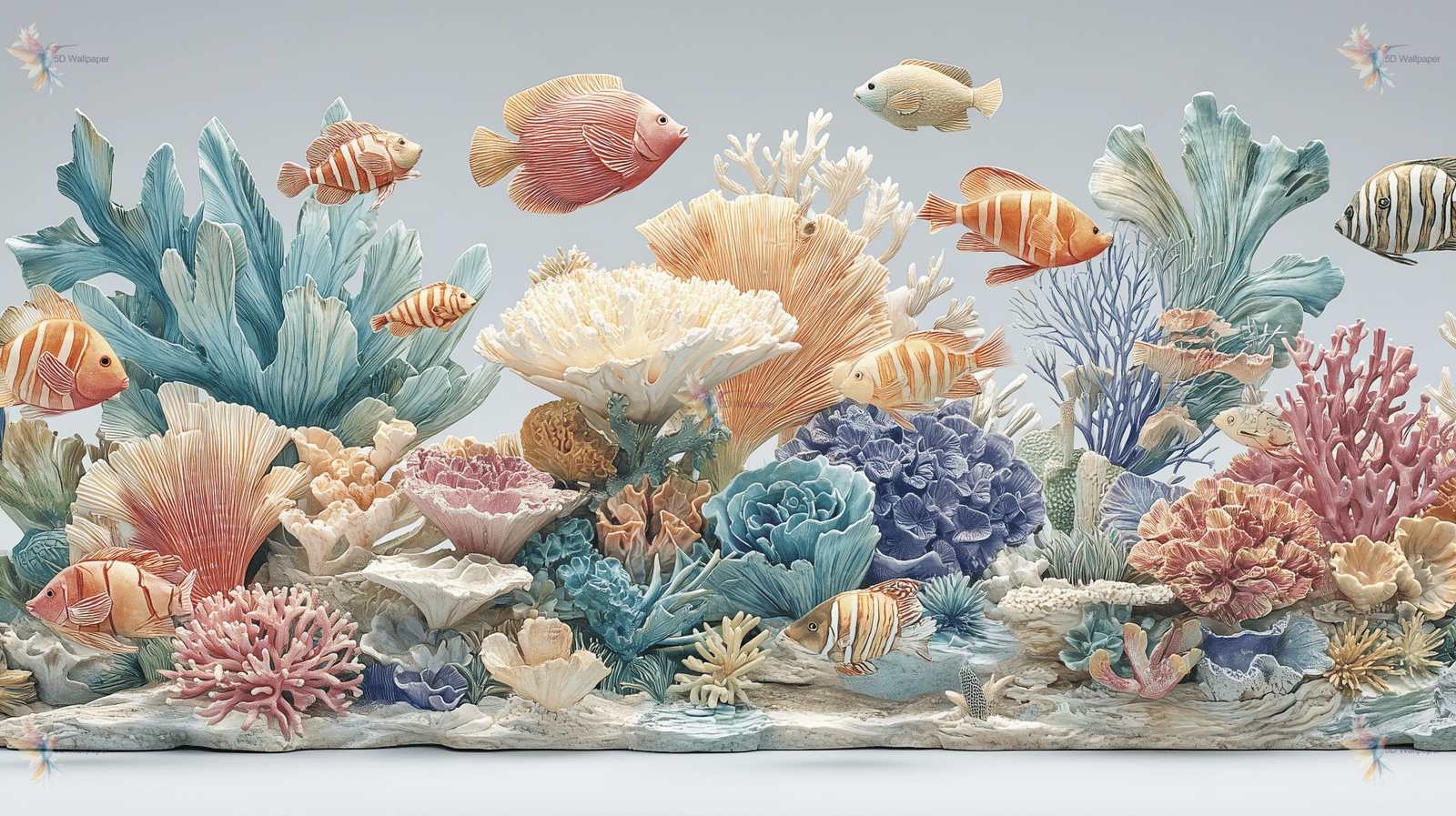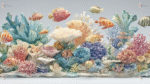 A vibrant underwater scene featuring various colorful fish and coral formations in diverse shapes and hues.