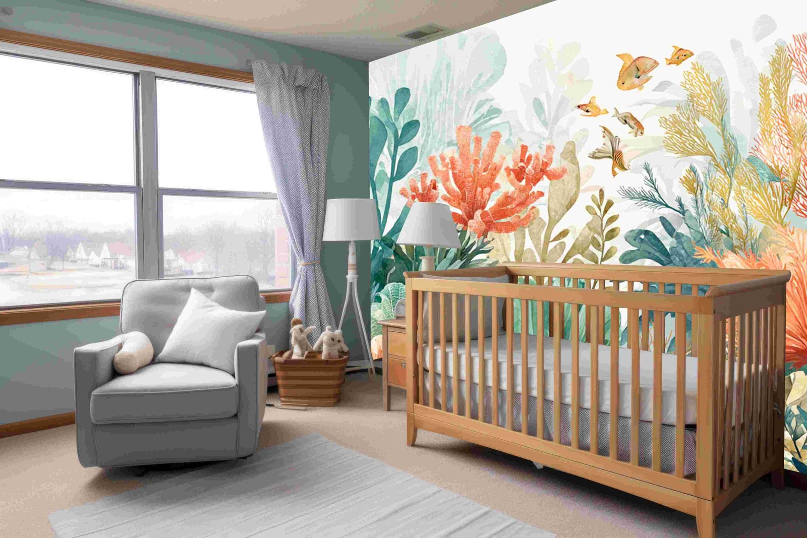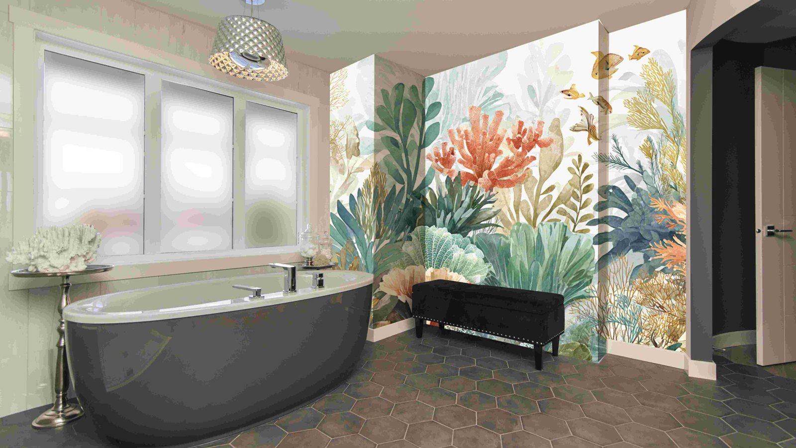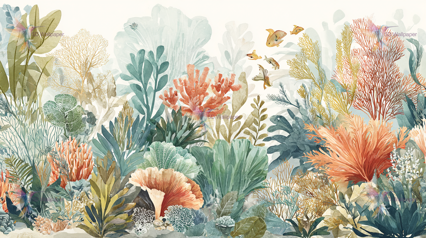 A vibrant underwater scene featuring various corals, seaweed, and small fish swimming among the colorful marine life.