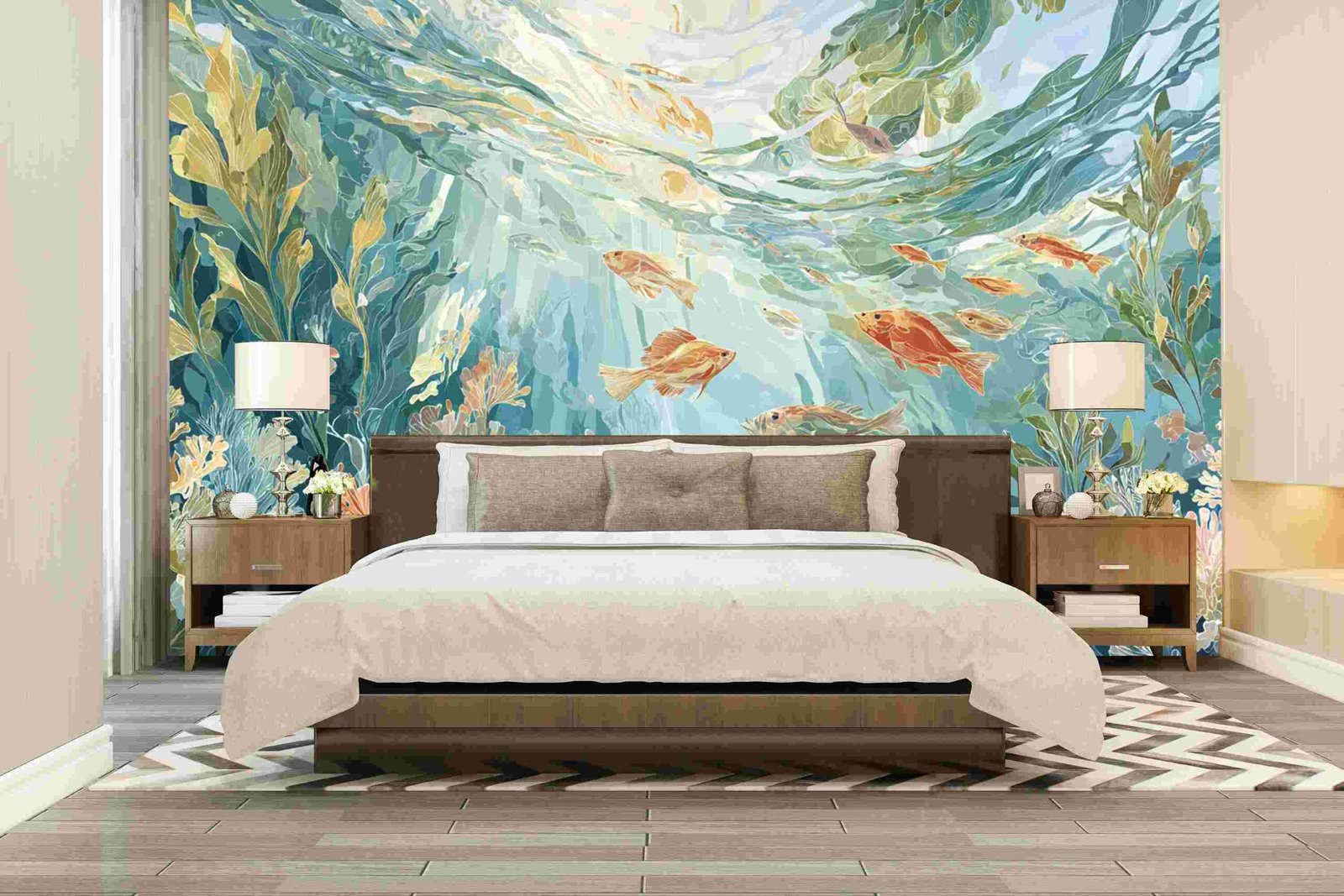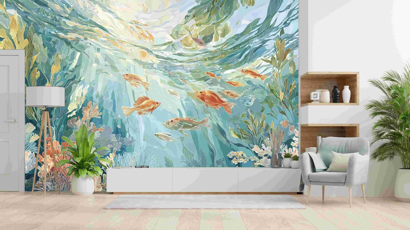 Various fish swim among vibrant coral and seaweed in a clear underwater scene.