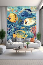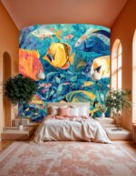A vibrant underwater scene featuring various fish and coral in a mosaic style.