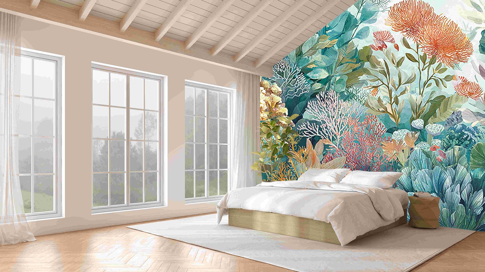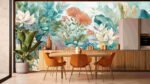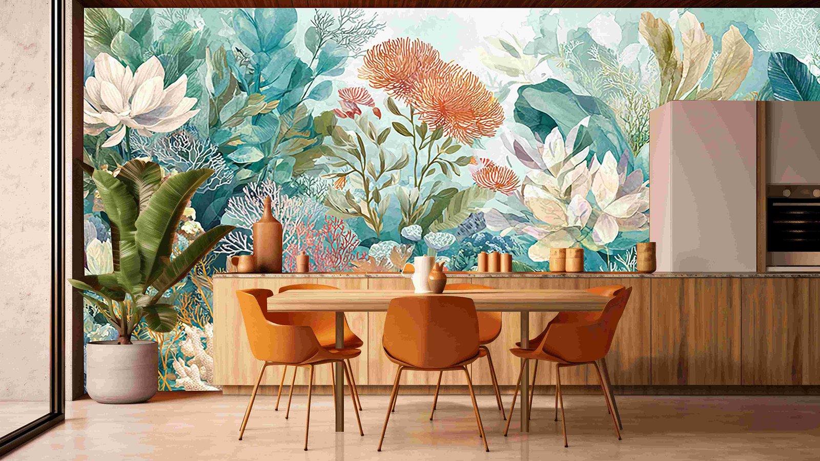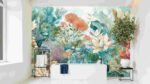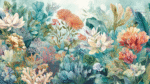 A vibrant collection of various flowers and leaves in soft pastel colors, creating a lush, artistic underwater scene.