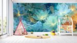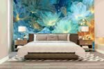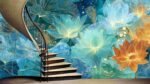 A vibrant illustration featuring various lotus flowers in shades of blue, orange, and white against a dark blue background.