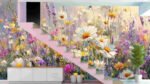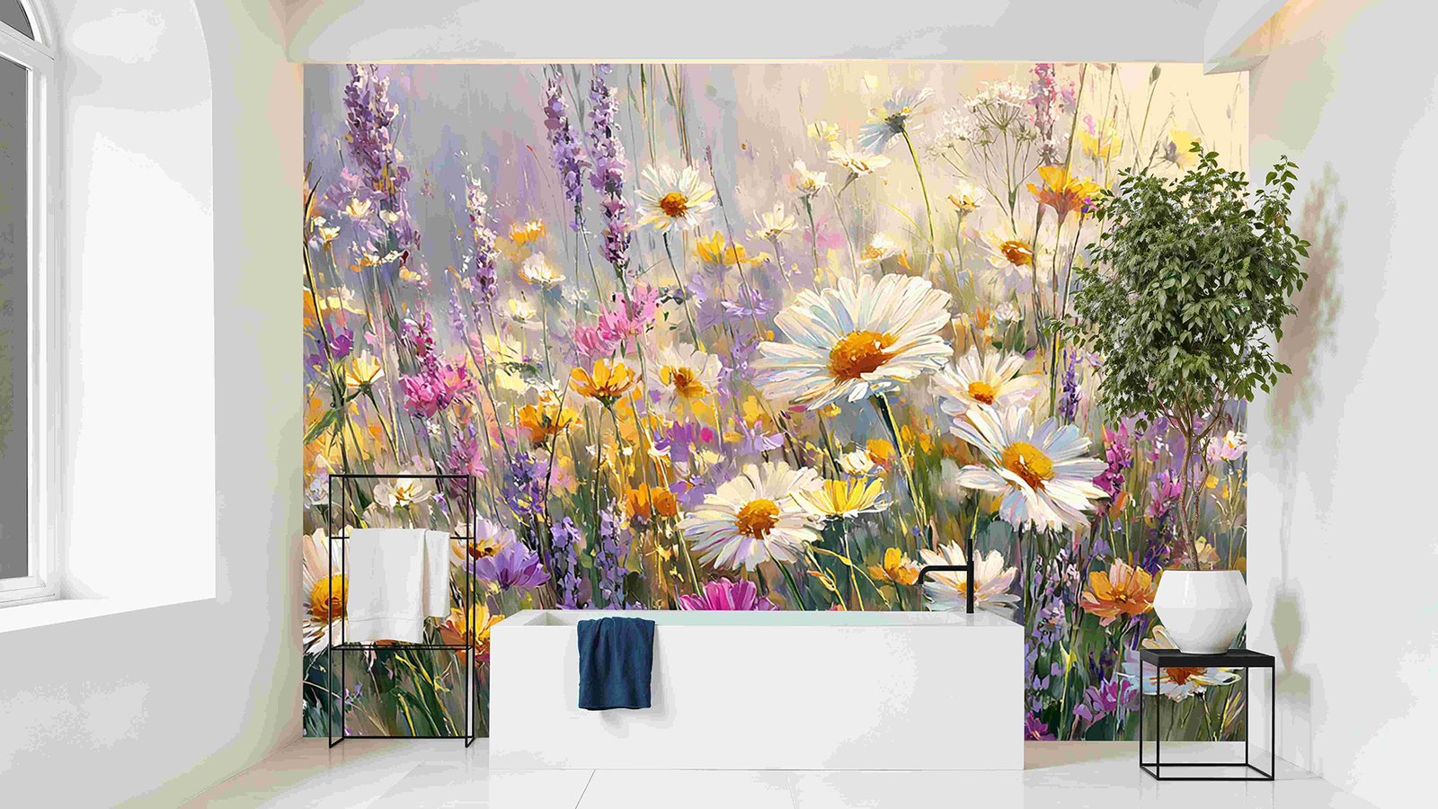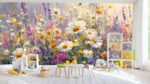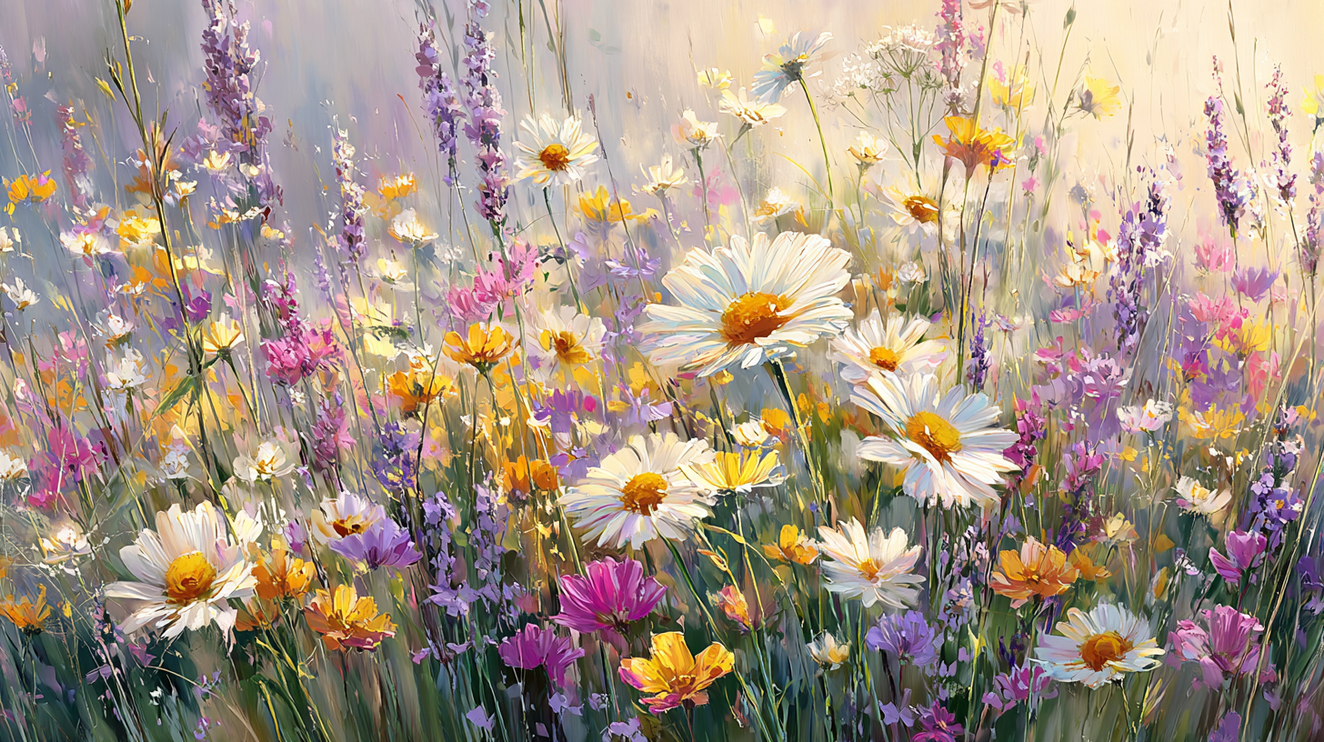 A vibrant meadow filled with various flowers in shades of white, yellow, pink, and purple.