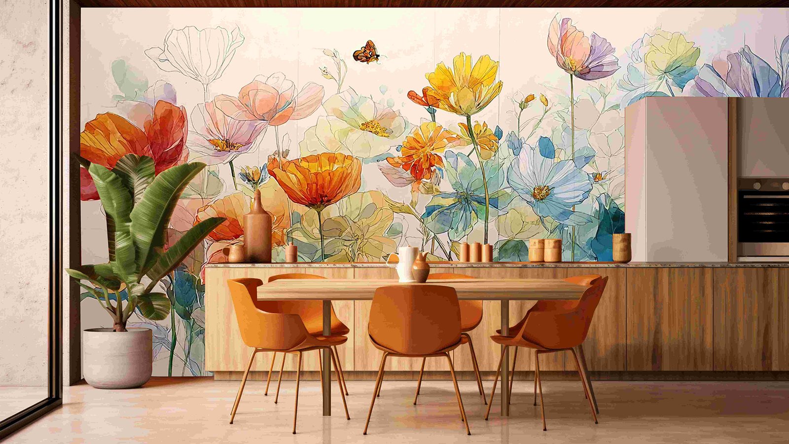A vibrant watercolor painting featuring various flowers in shades of orange, blue, and yellow, with a butterfly hovering above.