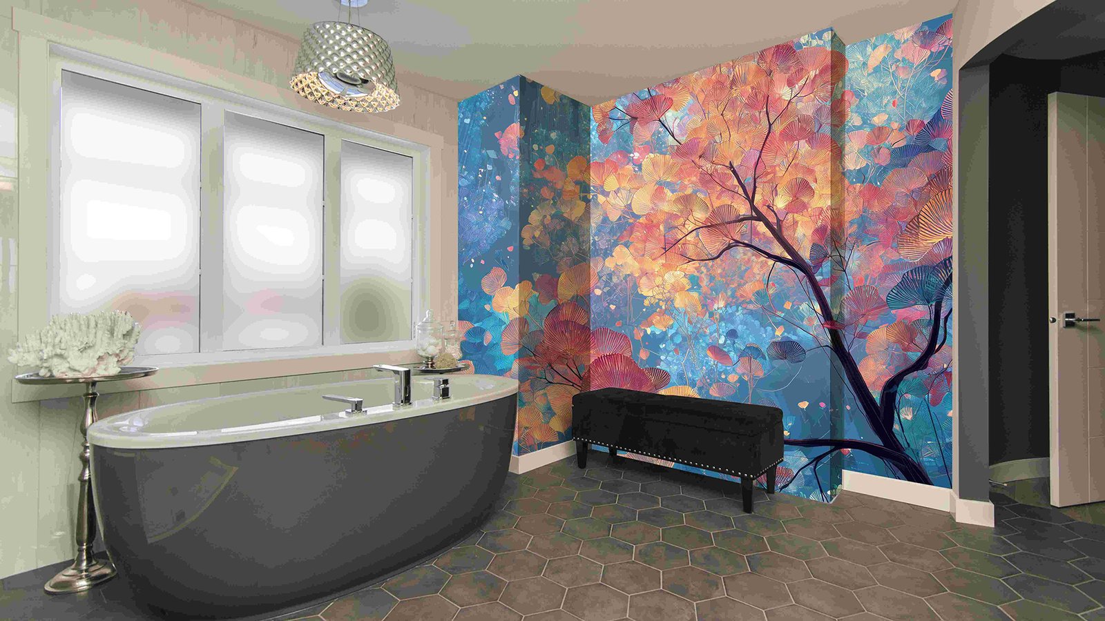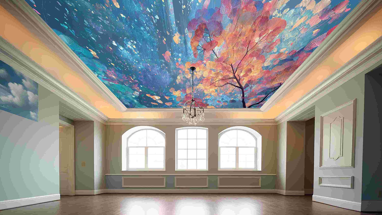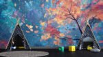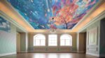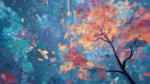 A vibrant canopy of multicolored leaves with intricate patterns against a blue background.