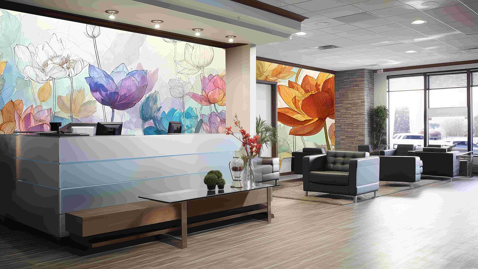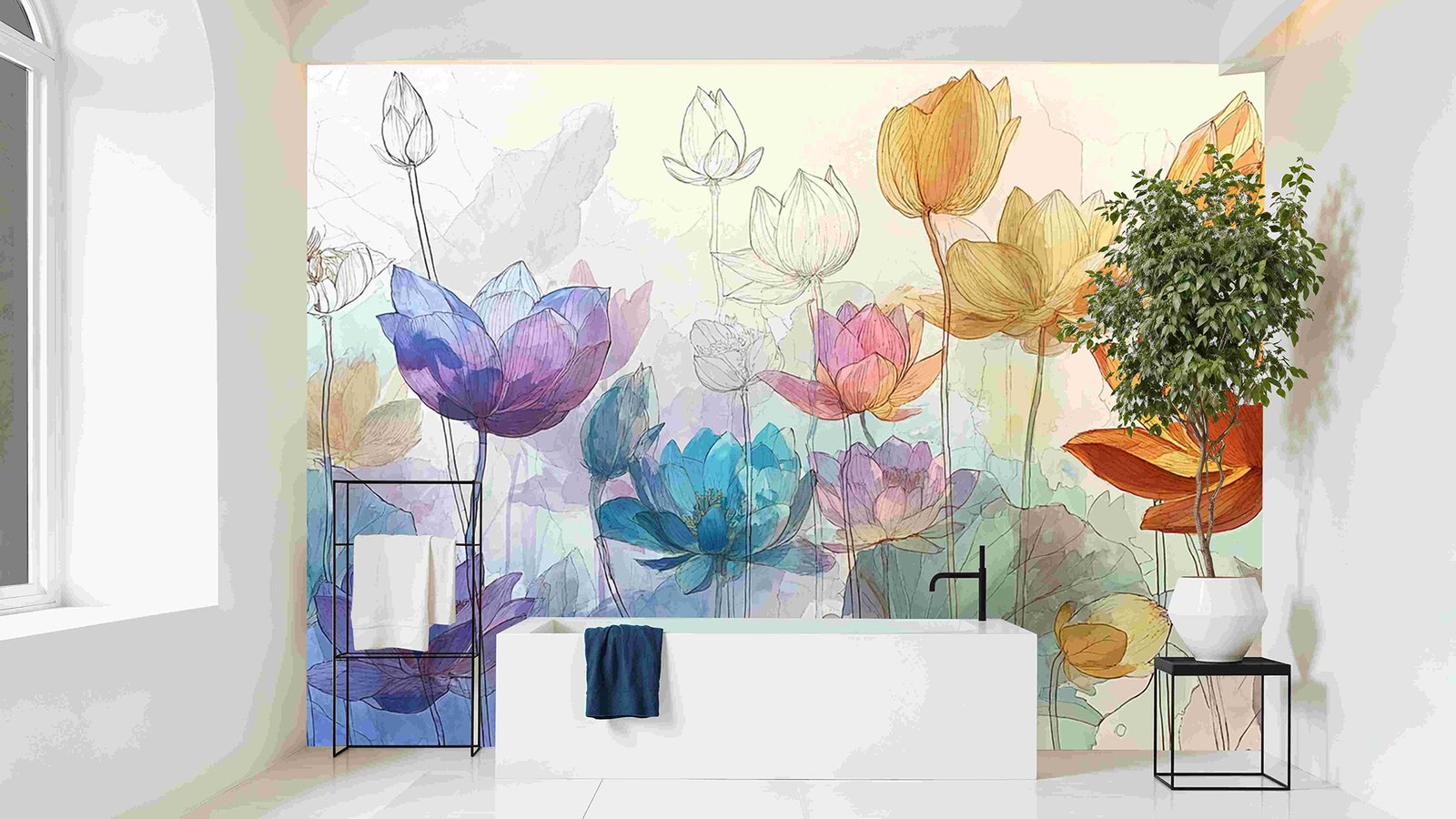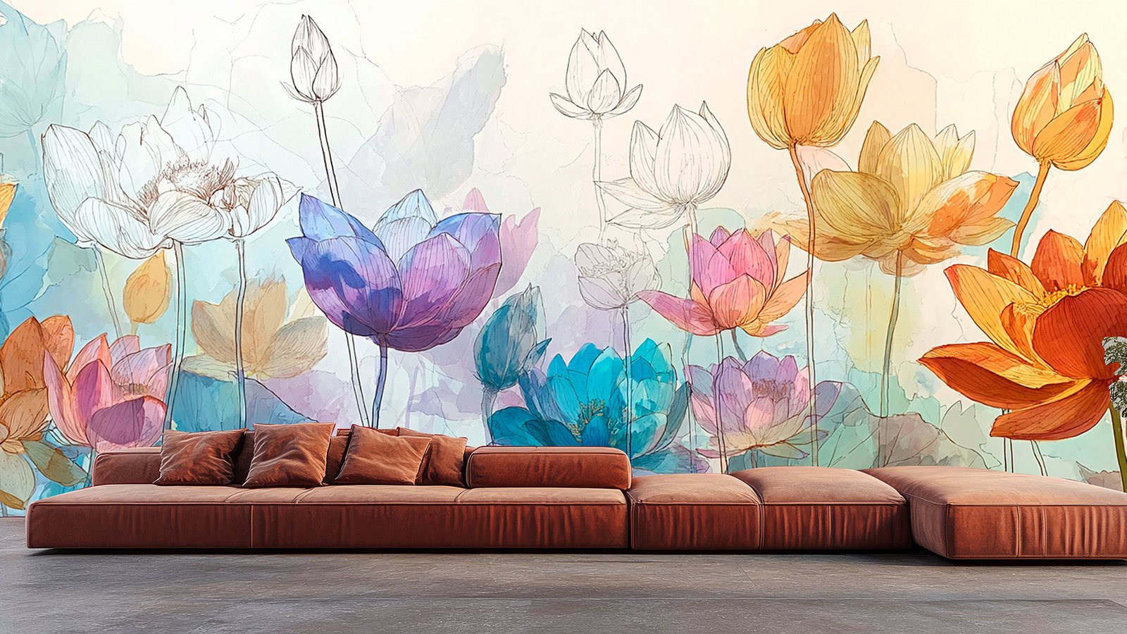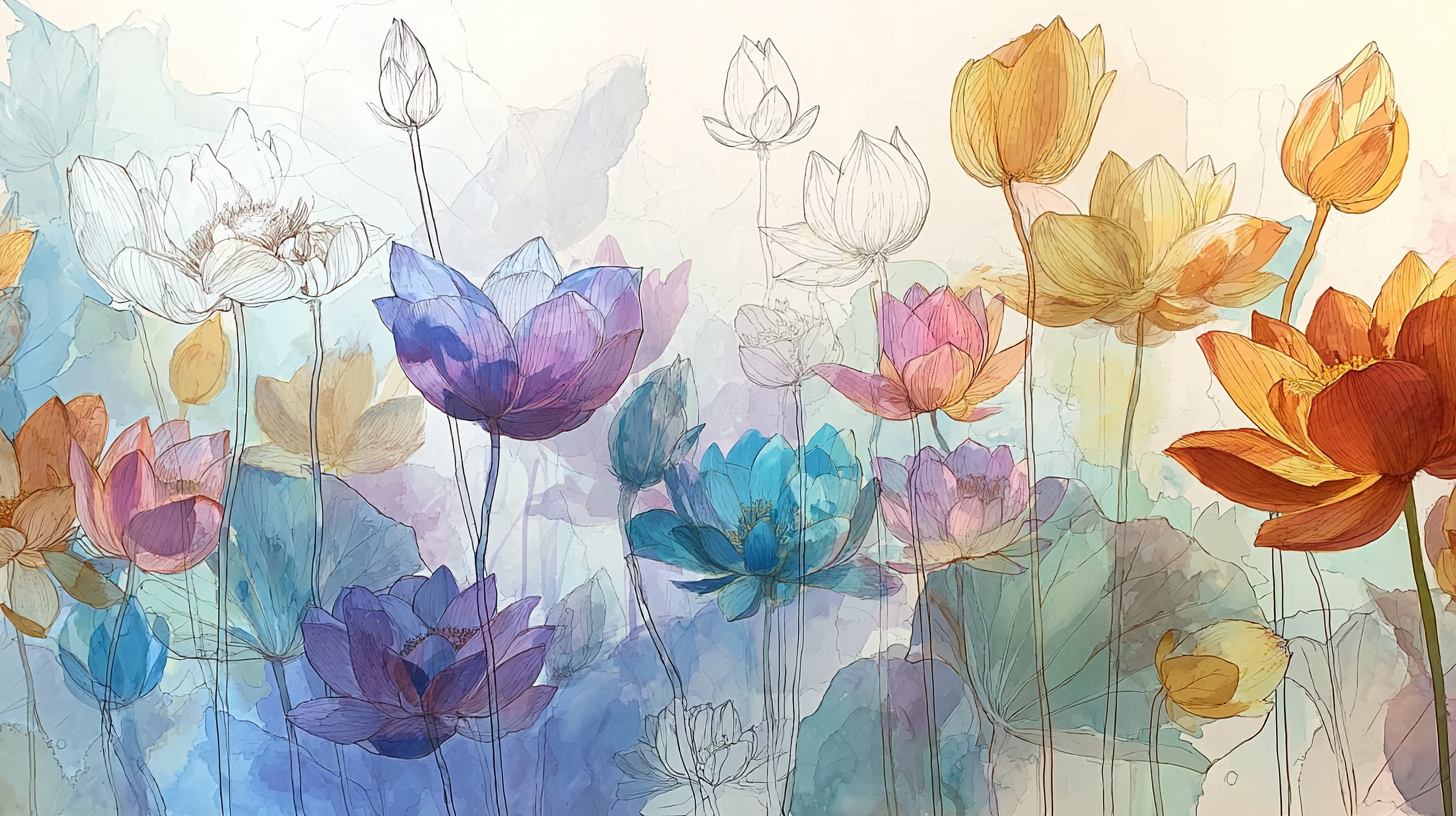 A variety of lotus flowers in different colors, including blue, pink, and orange, with soft watercolor backgrounds.