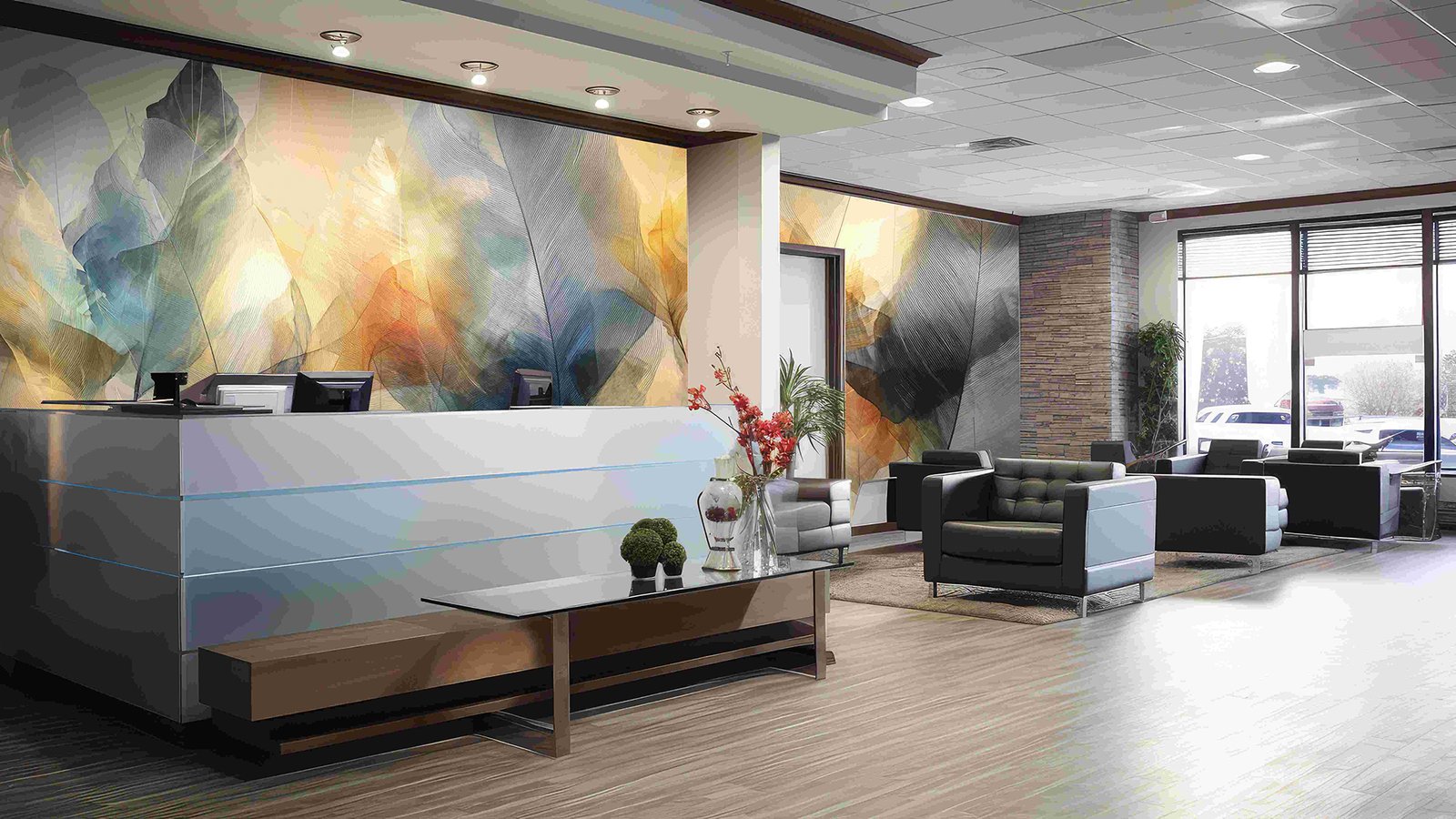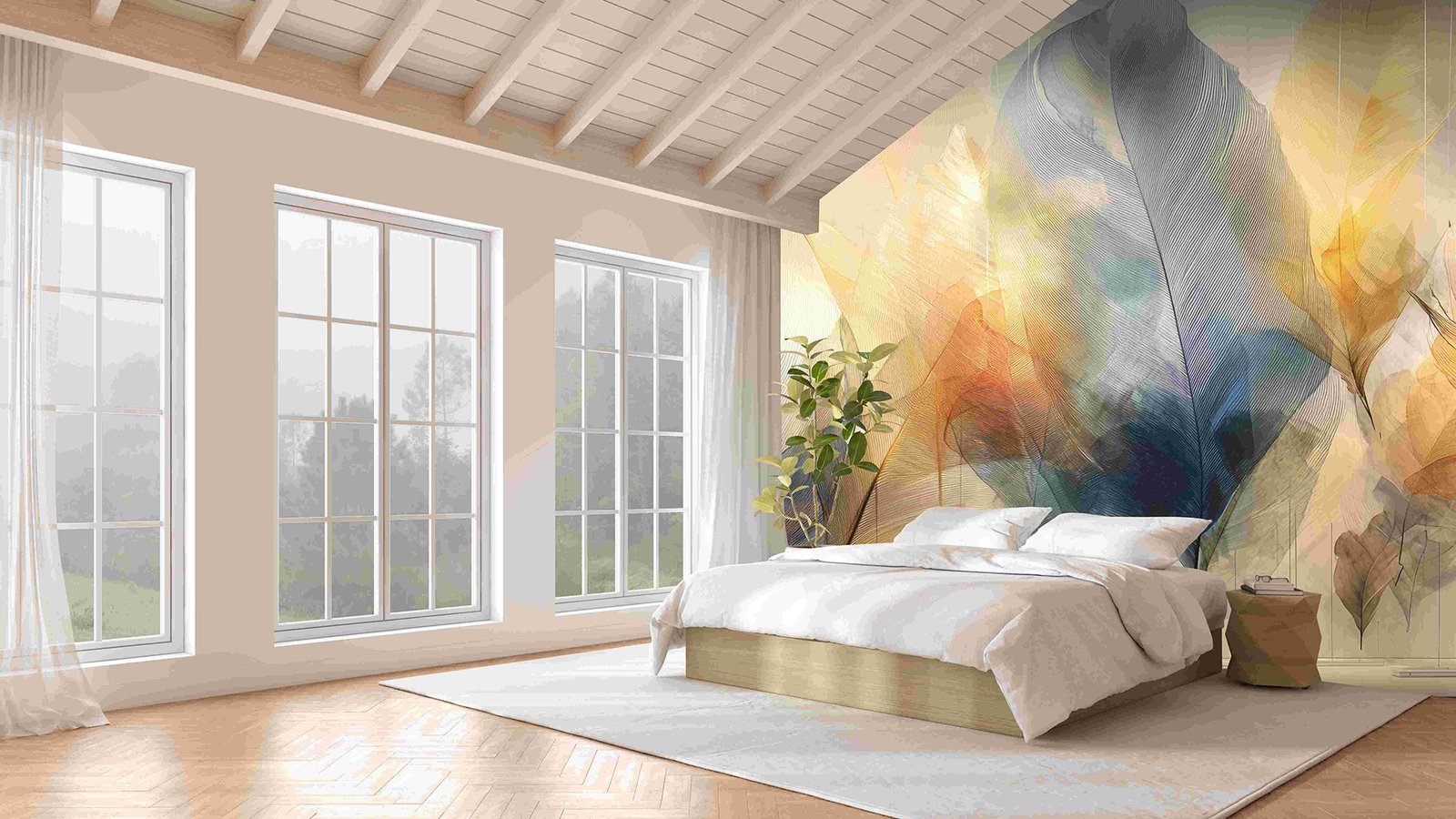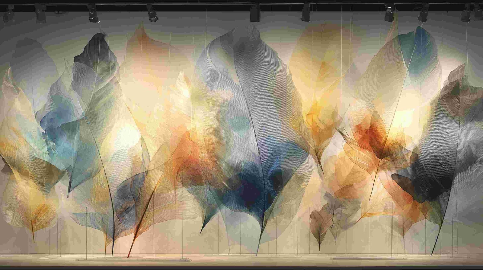 A collection of large, translucent leaves in various colors, arranged artistically against a light background.