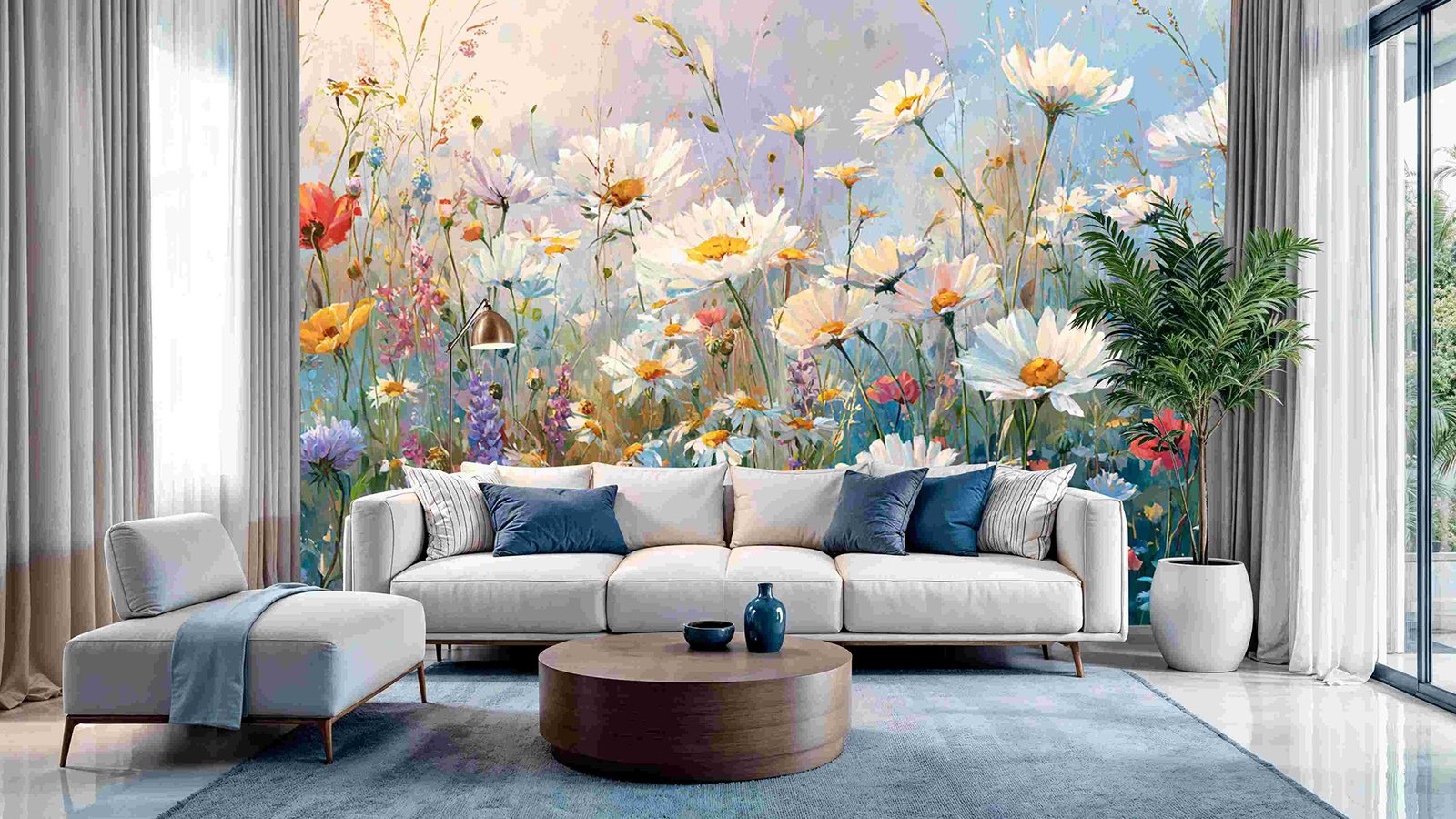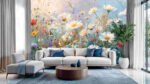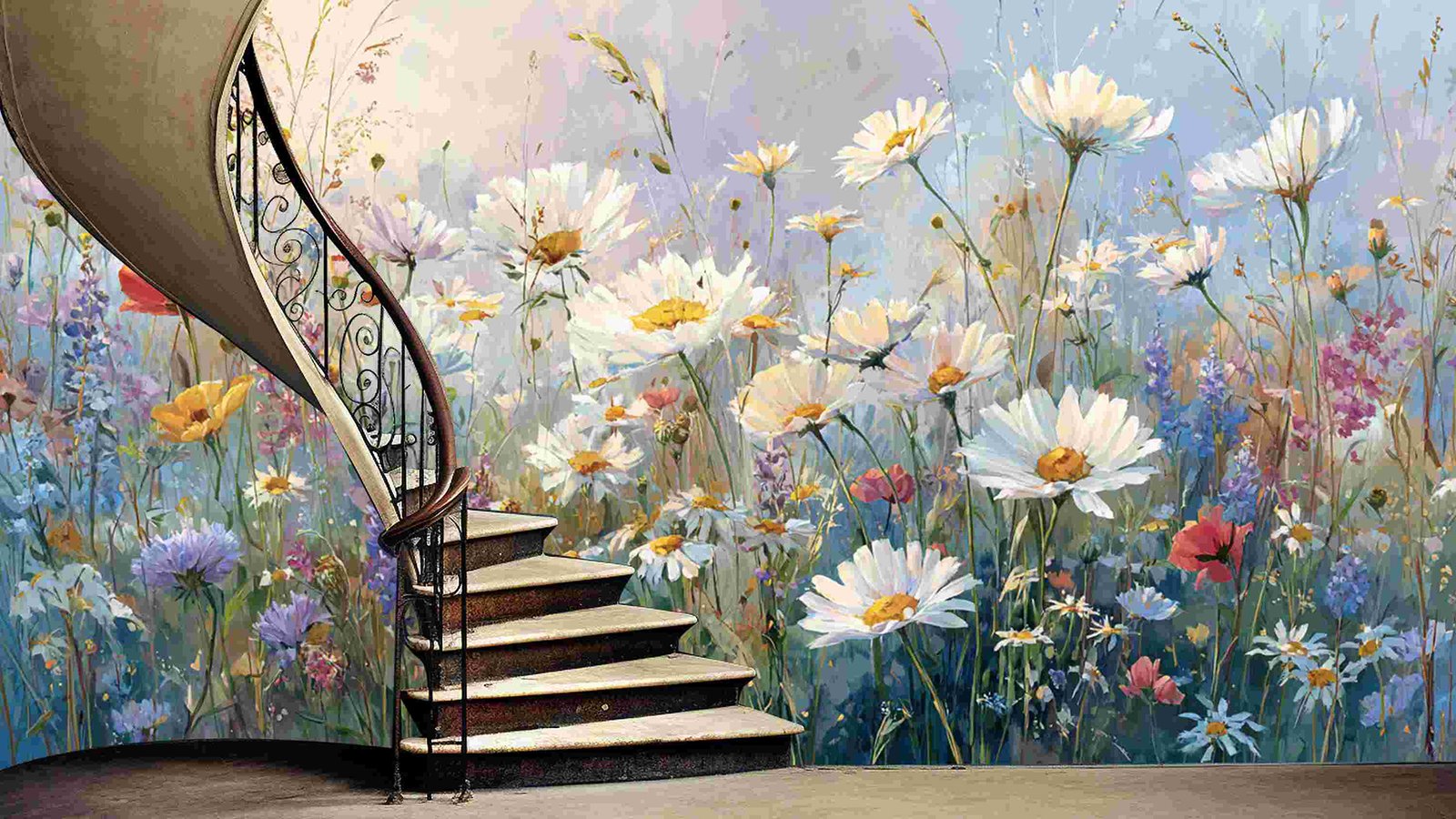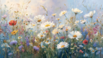 A vibrant field filled with various wildflowers in shades of white, pink, purple, and red against a soft blue background.