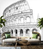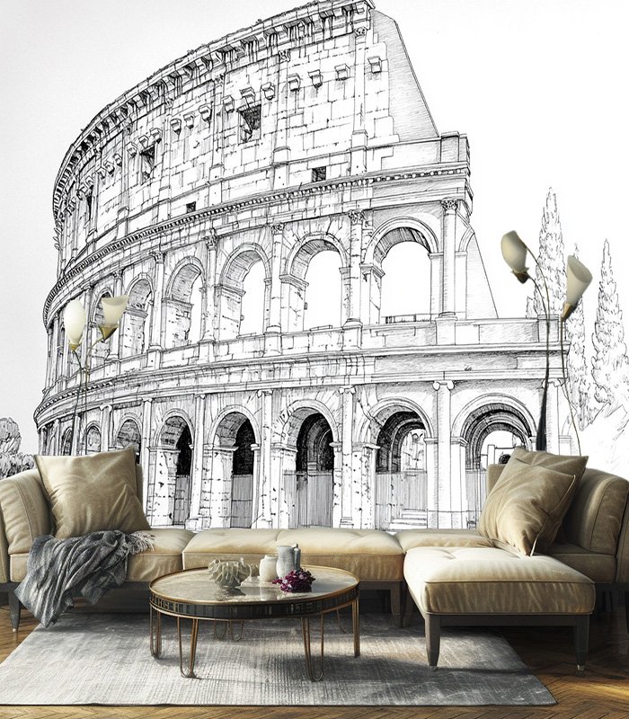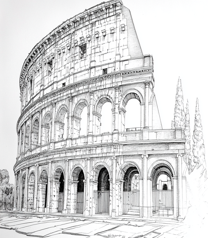 Intricate architectural sketch of the Colosseum, showcasing detailed arches and columns, capturing the grandeur of ancient Roman engineering amidst serene surroundings.