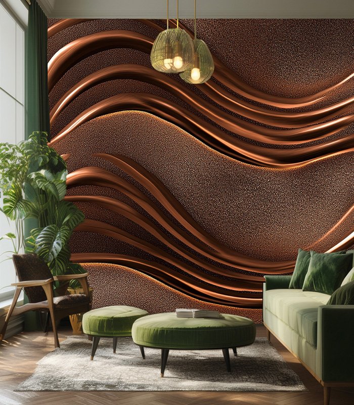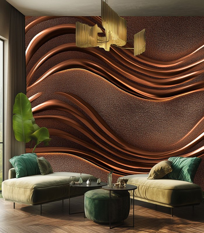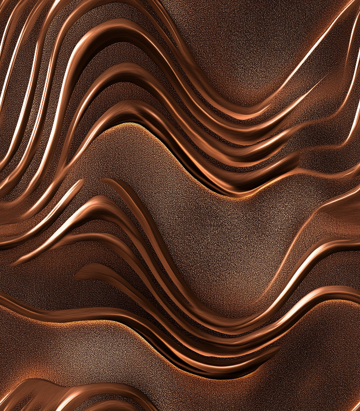 Abstract copper waves flow across a textured surface, creating a dynamic and elegant pattern with rich metallic tones and smooth, undulating lines.