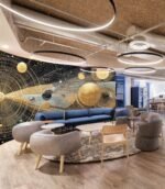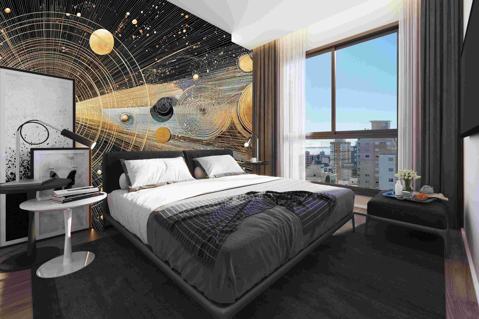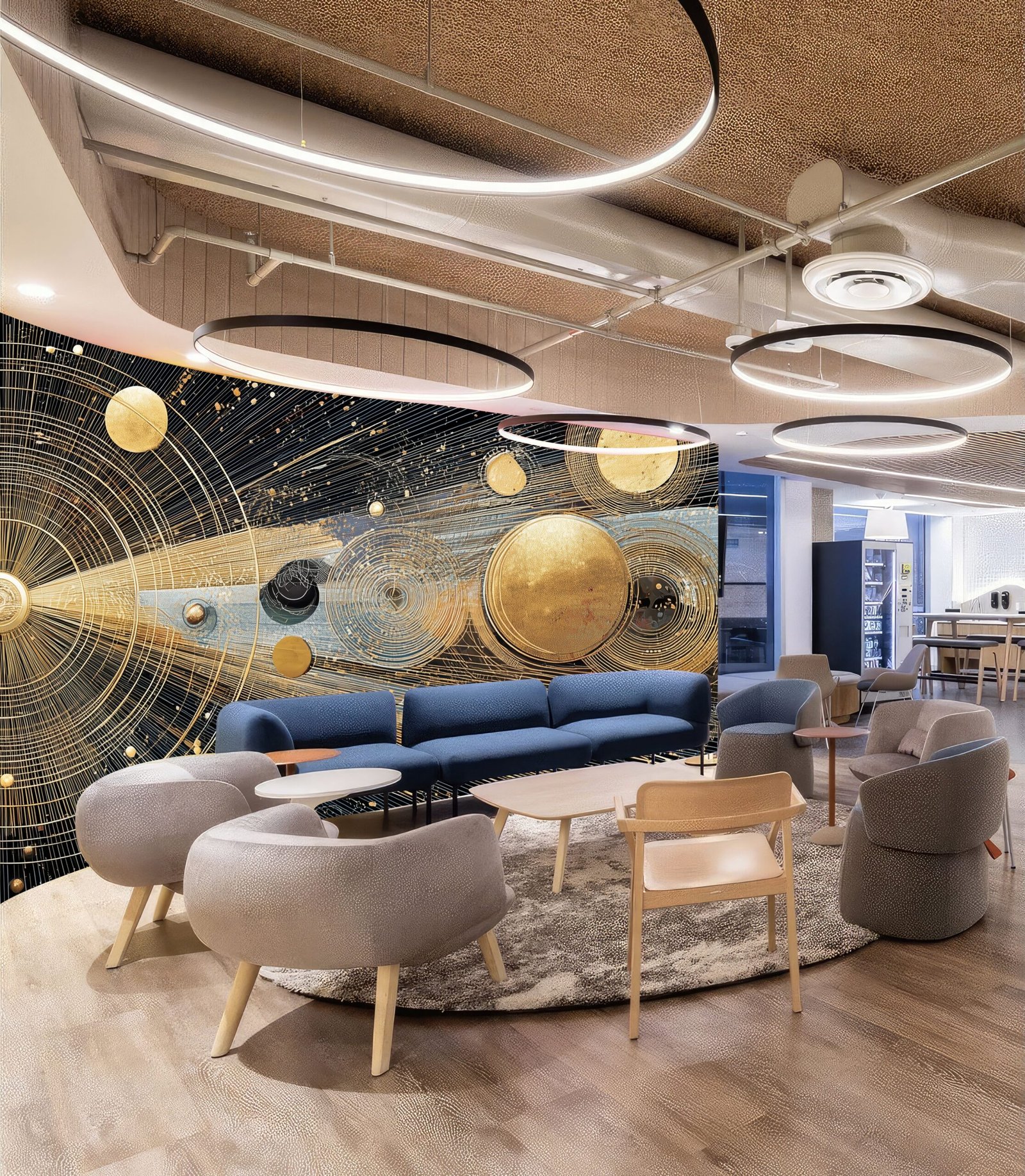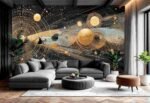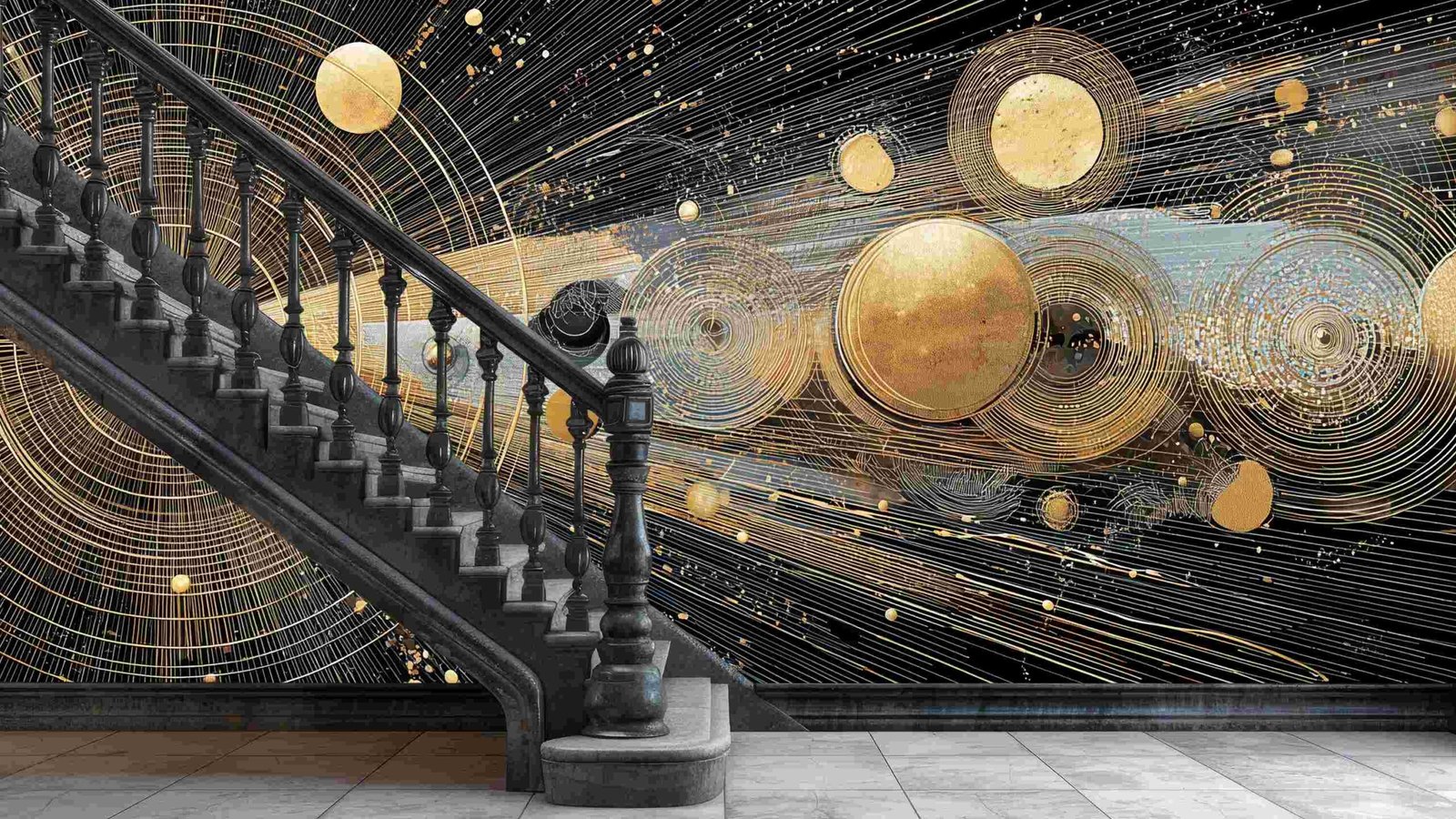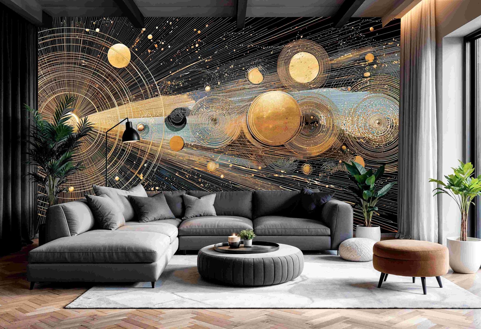 Abstract representation of celestial bodies with golden circles and lines against a dark background.