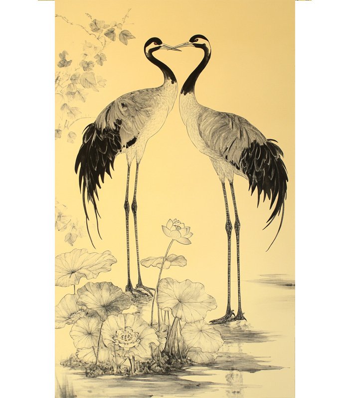 Two elegant cranes face each other, surrounded by delicate lotus flowers and leaves, creating a serene and harmonious scene in traditional ink style.