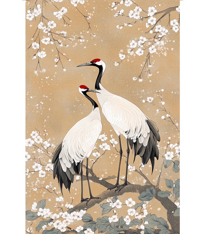 Two elegant cranes perched on a branch, surrounded by delicate cherry blossoms, create a serene and harmonious traditional Japanese art scene.