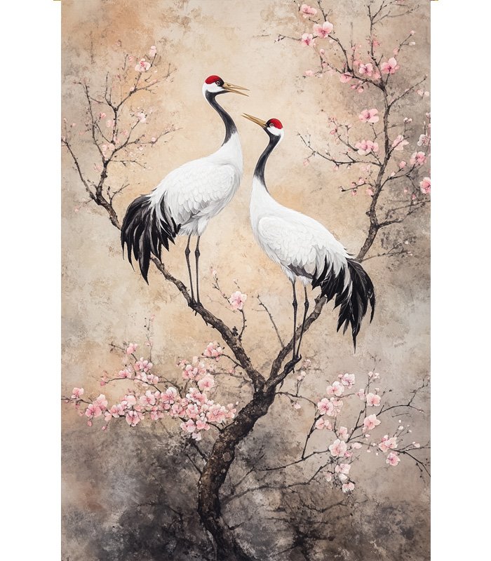 Two elegant cranes perched on a blossoming cherry tree, set against a textured background, symbolizing grace and tranquility in nature’s harmony.