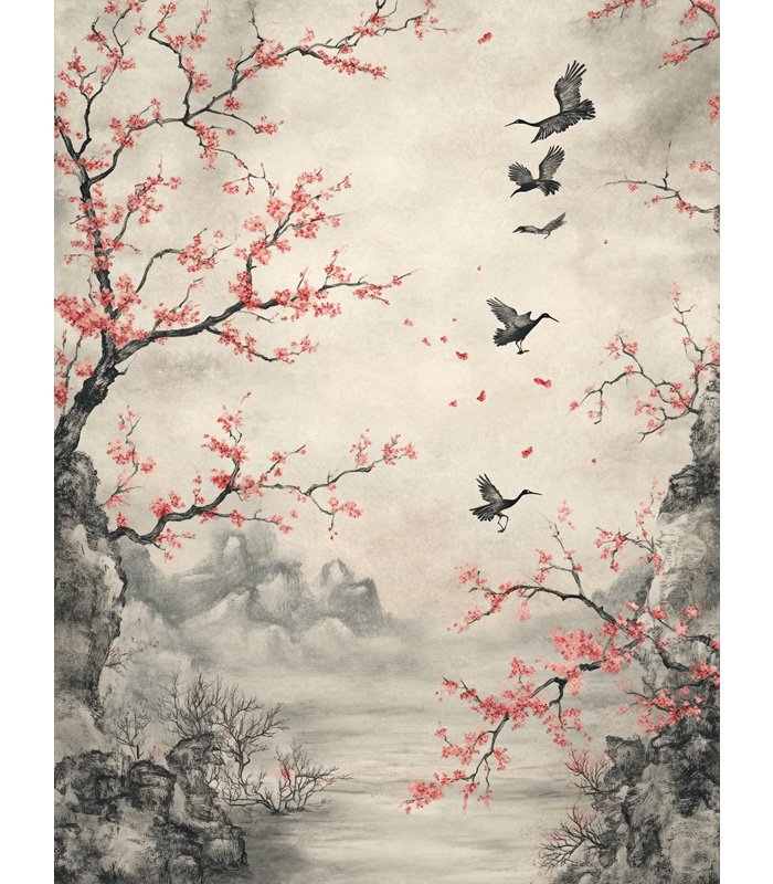 Cranes soar gracefully amidst cherry blossoms, set against a serene mountainous landscape, capturing the essence of tranquility and natural beauty in traditional Asian art.
