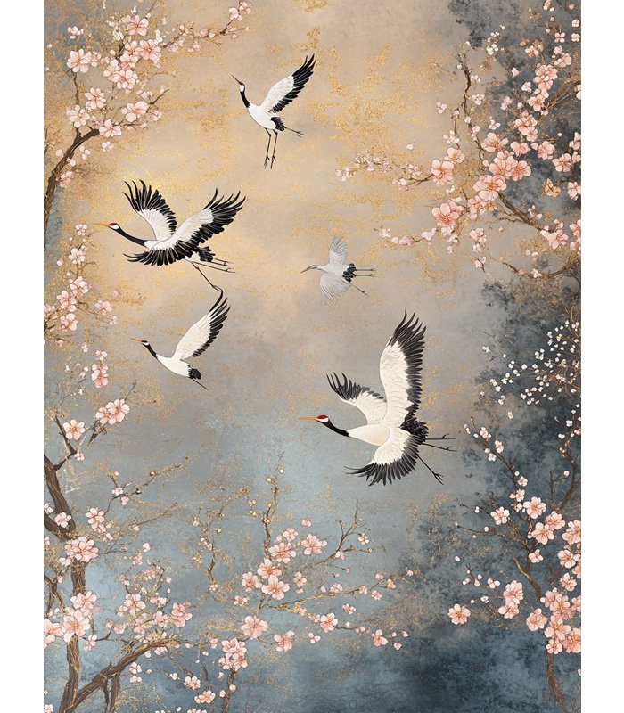 Cranes gracefully soar among delicate cherry blossoms, set against a textured, golden-hued sky, creating a serene and elegant scene of natural beauty.