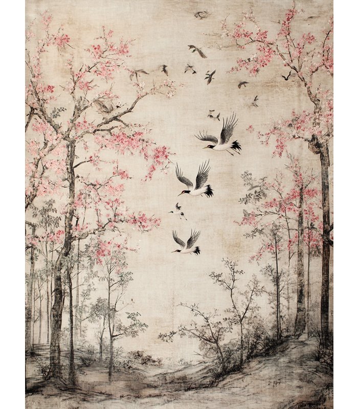 Delicate ink painting depicts cranes soaring among cherry blossoms, capturing serene beauty and harmony in a traditional Asian landscape.