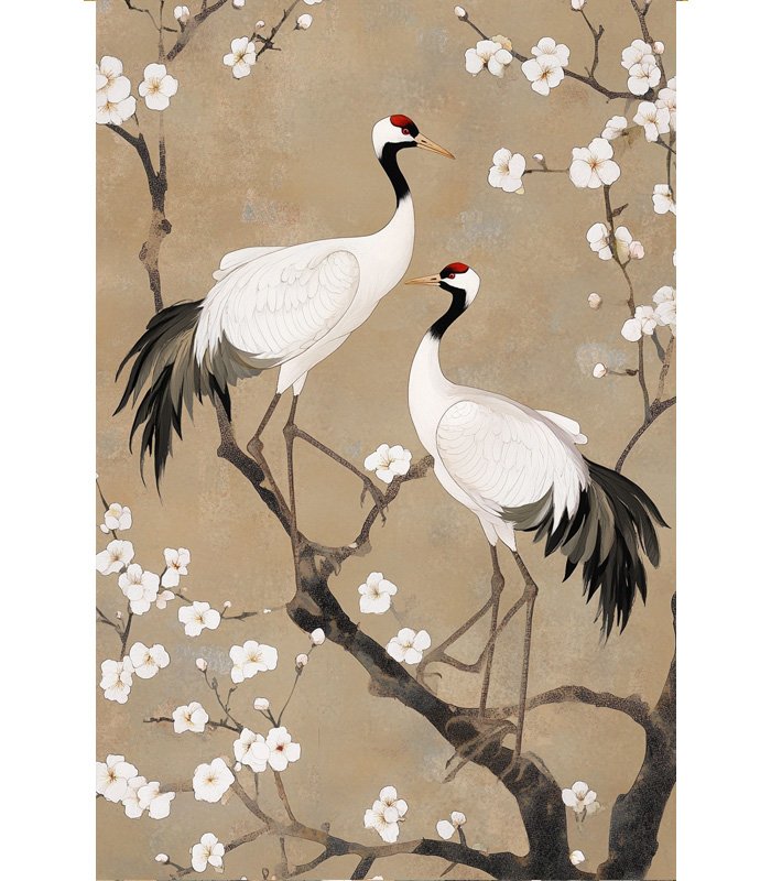 Two elegant cranes perched on blossoming branches, surrounded by delicate white flowers, creating a serene and harmonious traditional artwork.