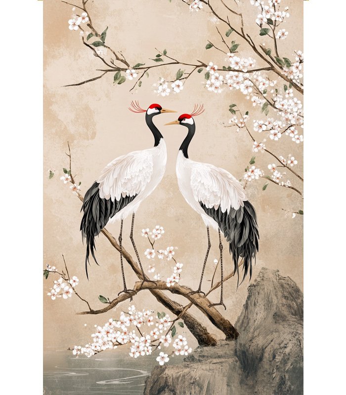 Two elegant cranes perched on a blossoming branch, surrounded by delicate cherry blossoms, creating a serene and harmonious nature scene.
