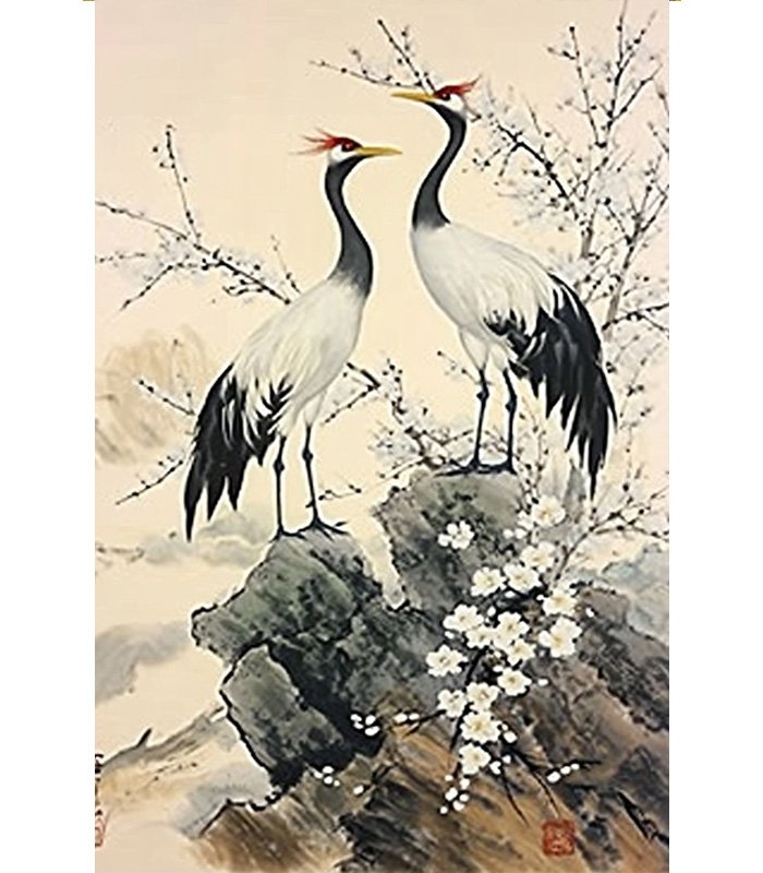 Two elegant cranes stand on a rocky outcrop, surrounded by delicate cherry blossoms, capturing a serene moment in traditional Asian art style.