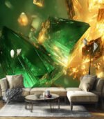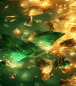 Glistening emerald and gold crystals float ethereally, casting radiant light and shadows in a mesmerizing dance of color and brilliance.