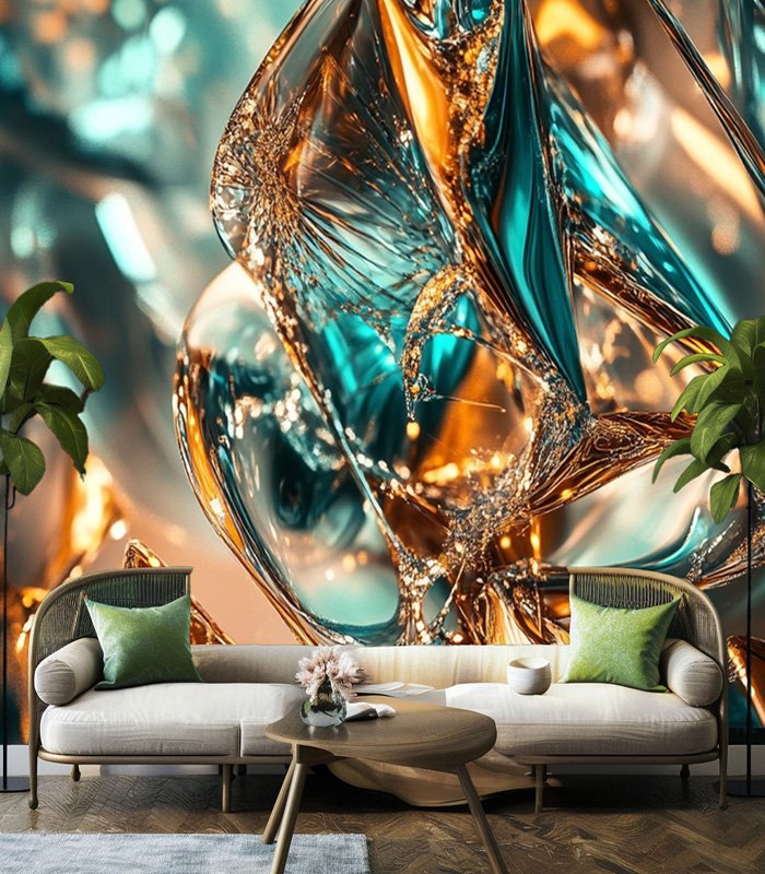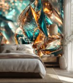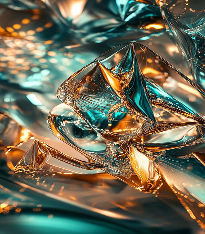 Abstract close-up of a crystalline structure with teal and golden hues, reflecting light and creating a mesmerizing, futuristic geometric pattern.