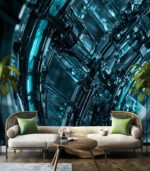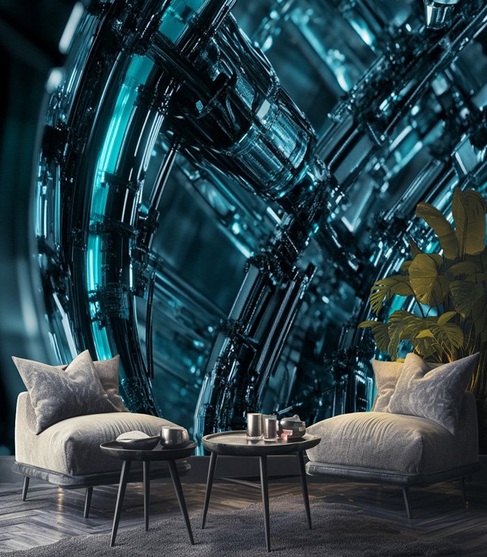 Futuristic, intricate machinery with glowing blue lights and metallic structures, creating a mesmerizing, high-tech, sci-fi atmosphere. Perfect for a cybernetic or space-themed setting.