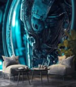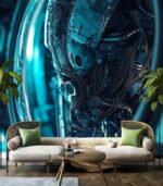 A futuristic, intricate robotic head encased in a glass dome, surrounded by complex machinery, illuminated by a cool blue light.