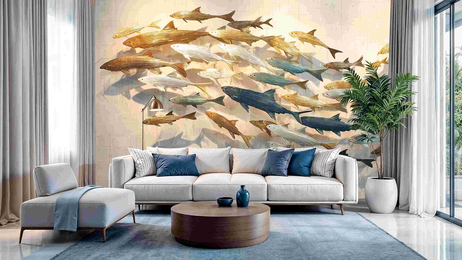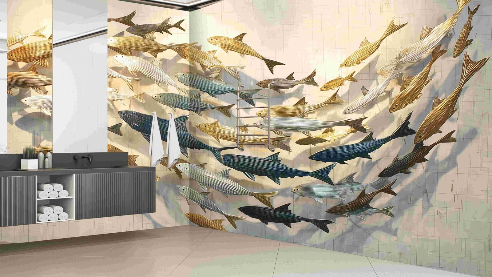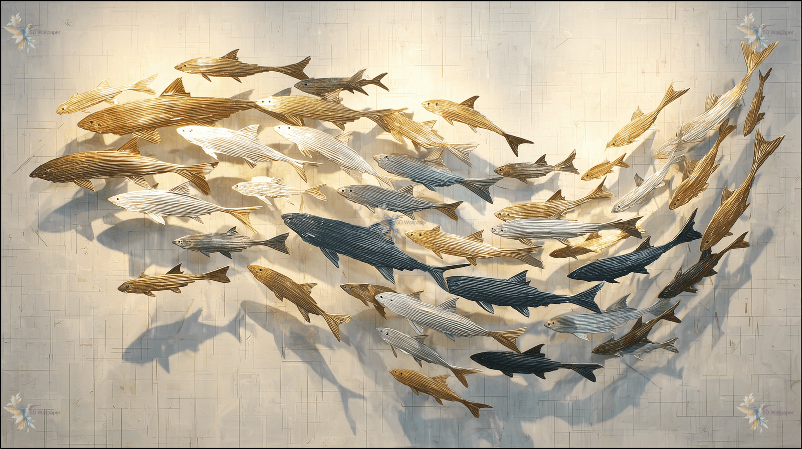 A collection of stylized fish in various colors arranged on a light background, creating a dynamic visual effect.