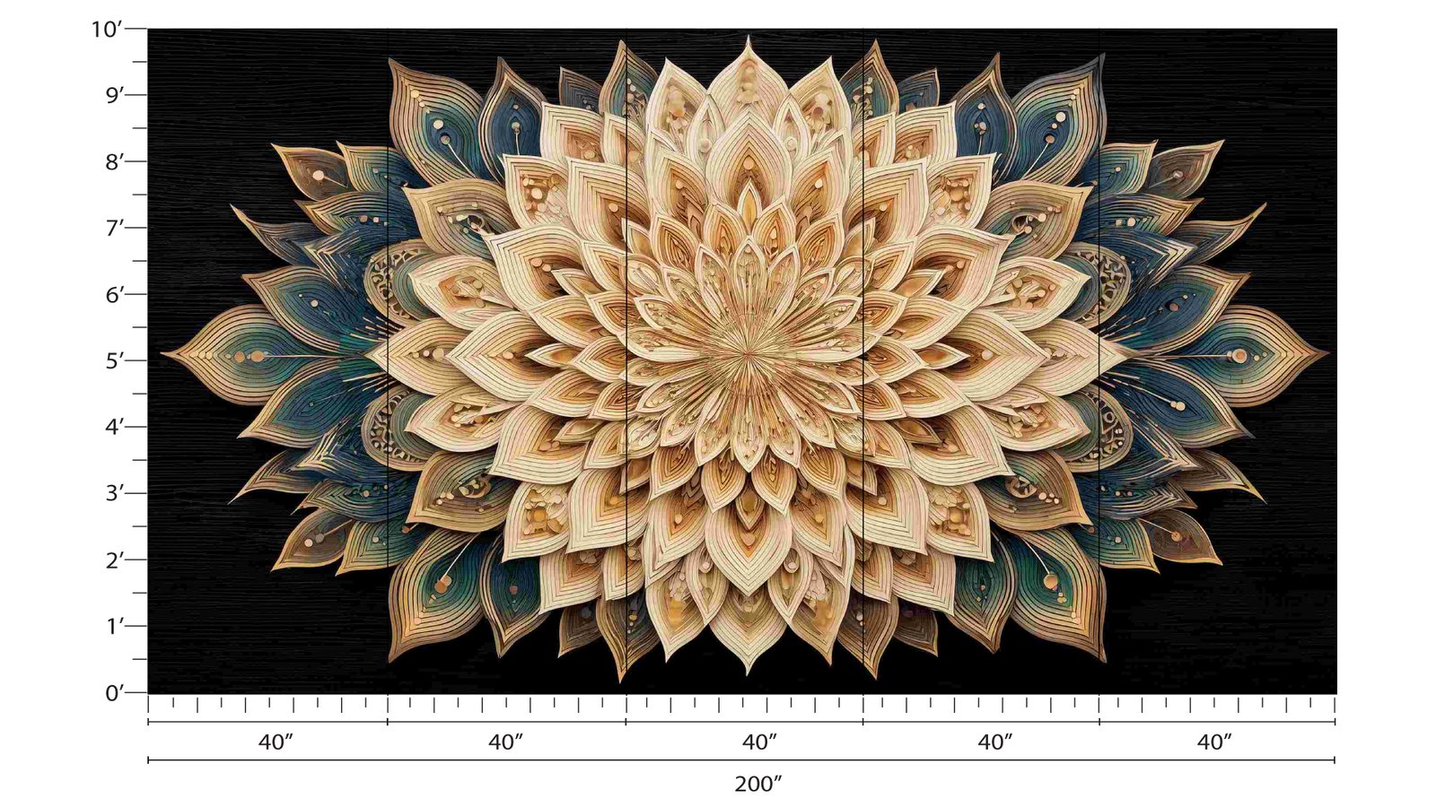 Intricate layered design with beige and teal colors resembling a flower, set against a dark background.