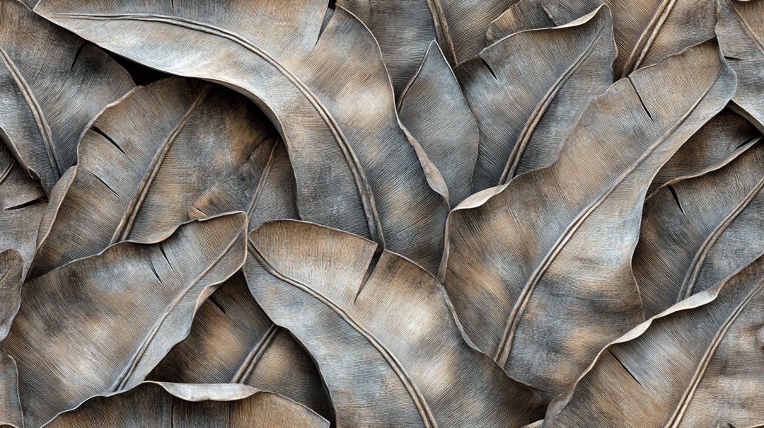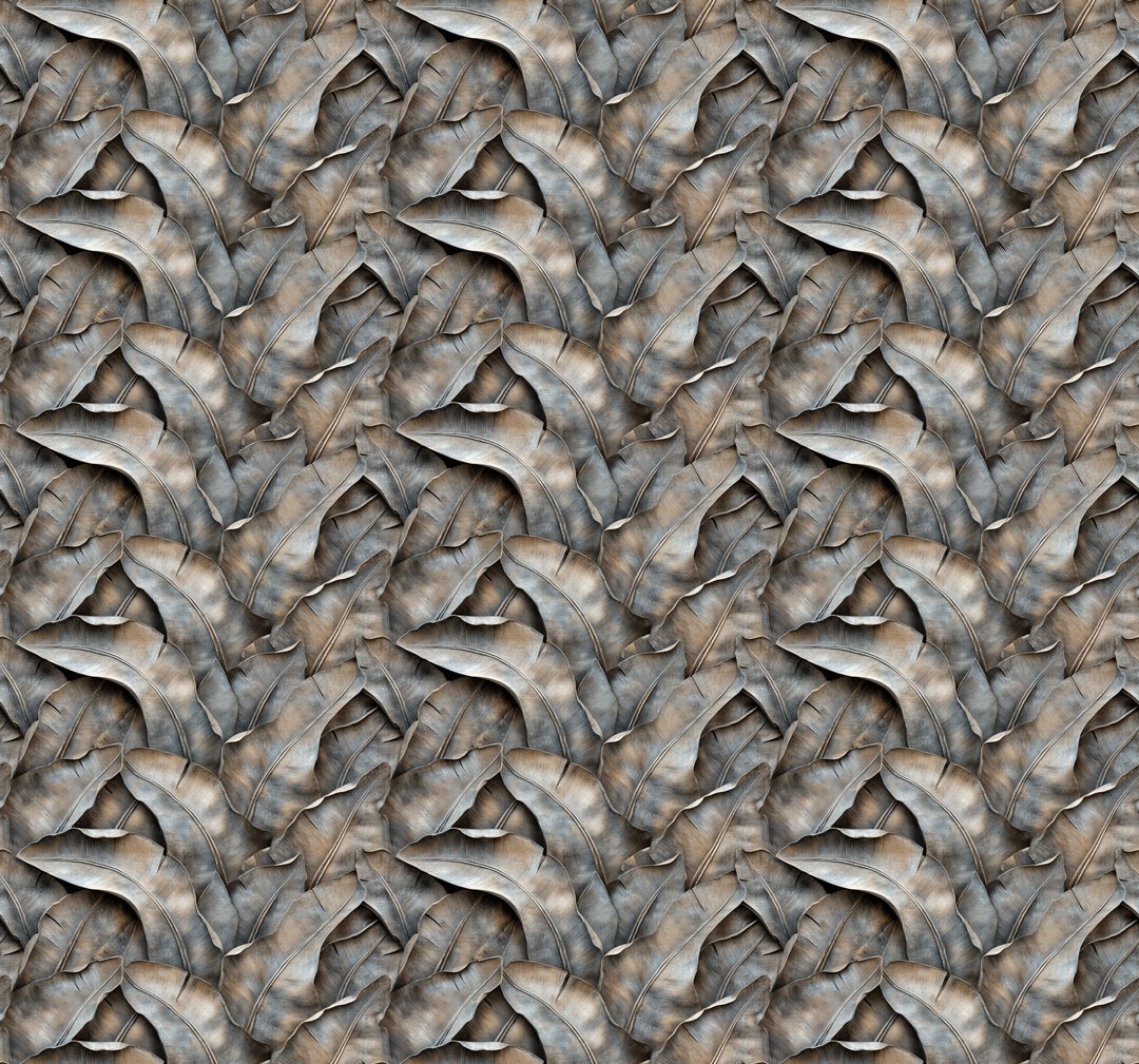 A textured arrangement of large, overlapping leaves in shades of brown and gray.
