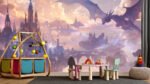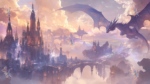 A large dragon hovers over a fantastical castle landscape with towers and bridges amidst clouds.