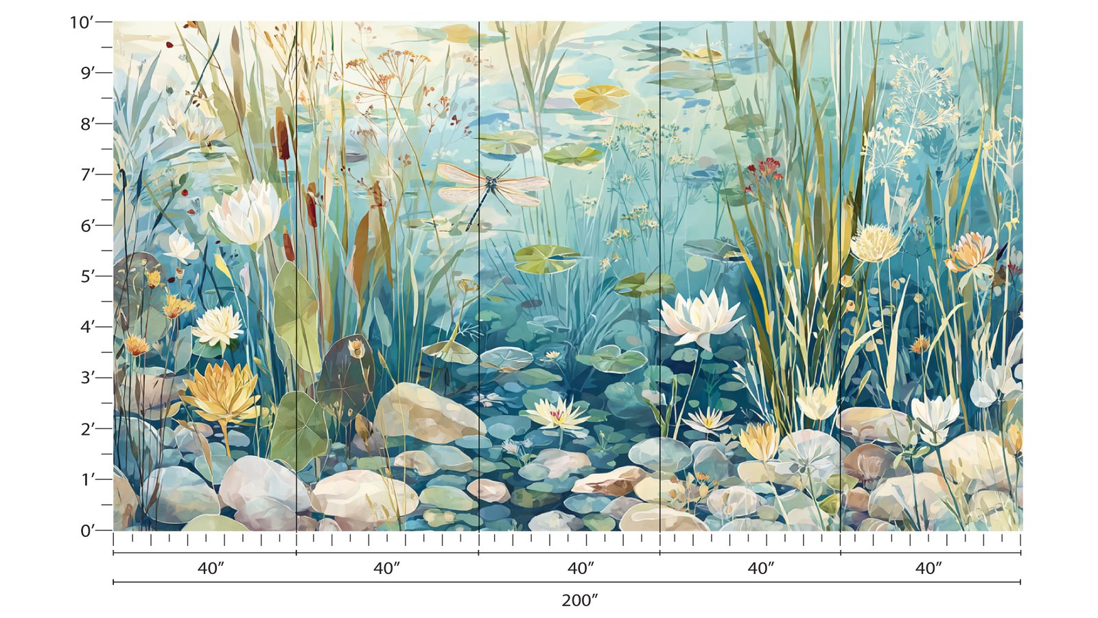 A dragonfly hovers above a serene pond filled with various water lilies and lush green plants.