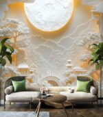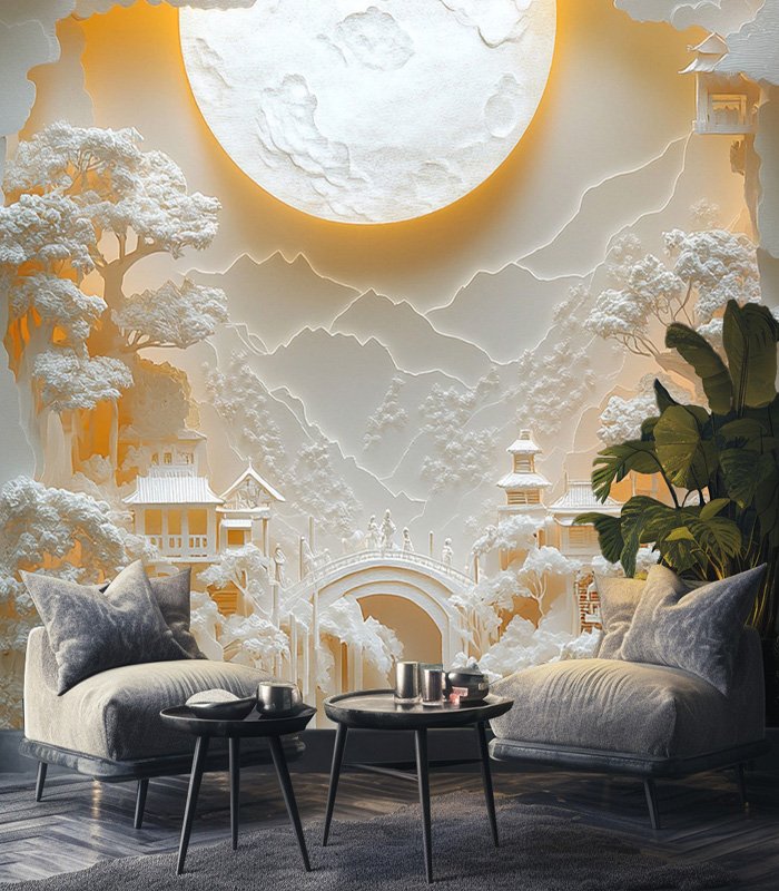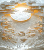 Intricate paper art depicts a serene landscape with a glowing sun, detailed trees, and figures crossing a bridge, creating a dreamlike atmosphere.