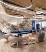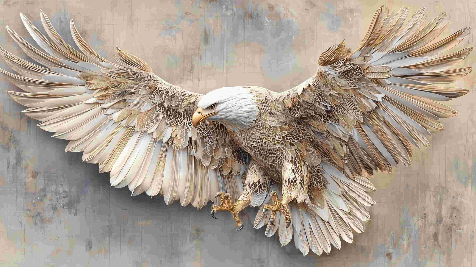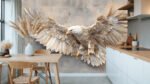 Intricate sculpture of an eagle with outstretched wings, crafted from layered materials.