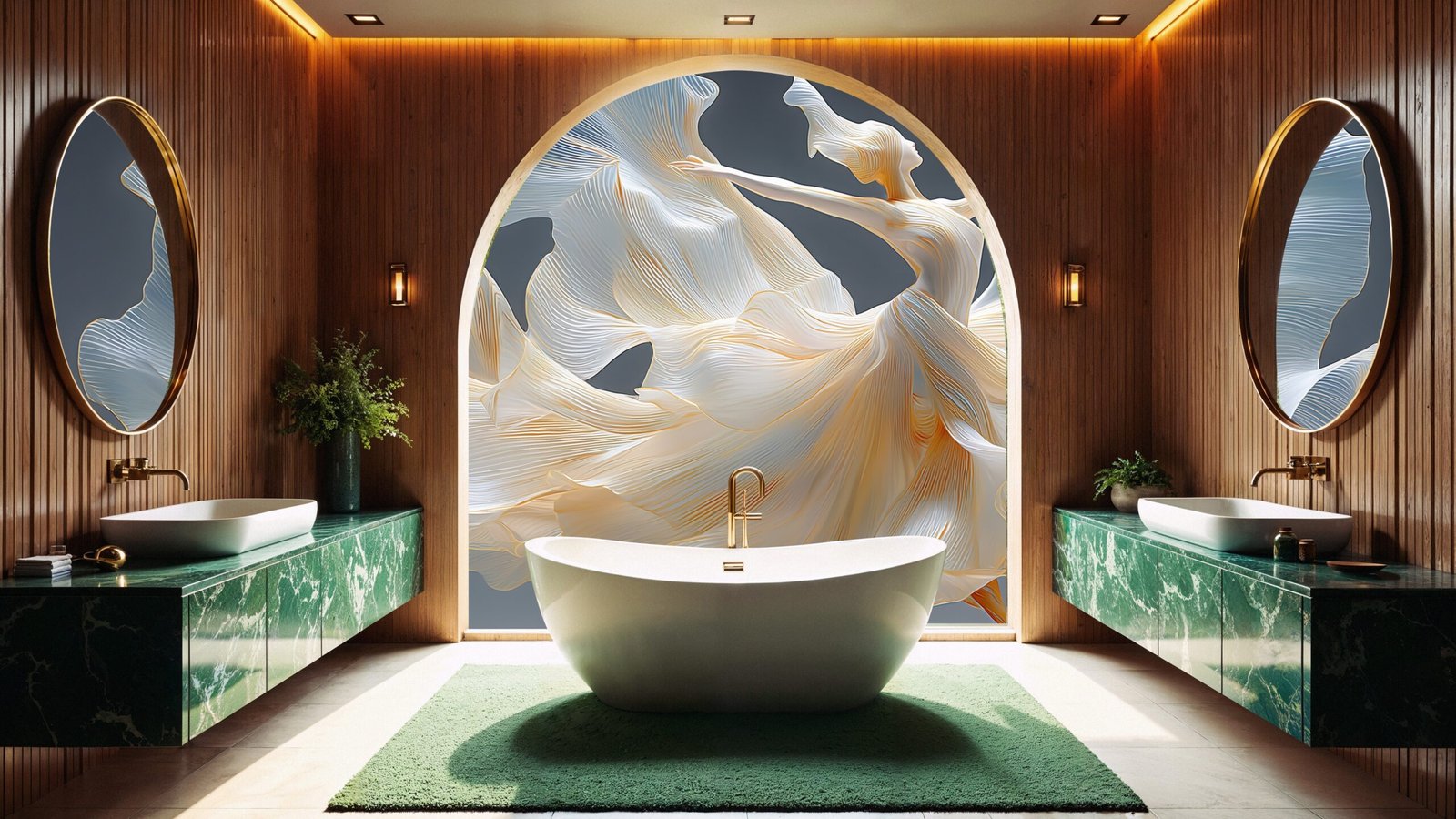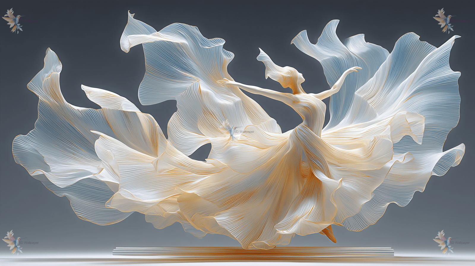 A graceful figure in a flowing dress, captured mid-motion with soft, translucent fabric swirling around.