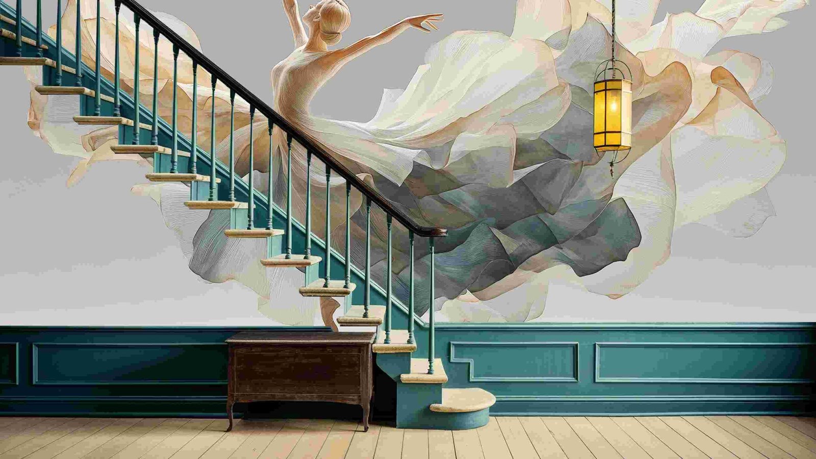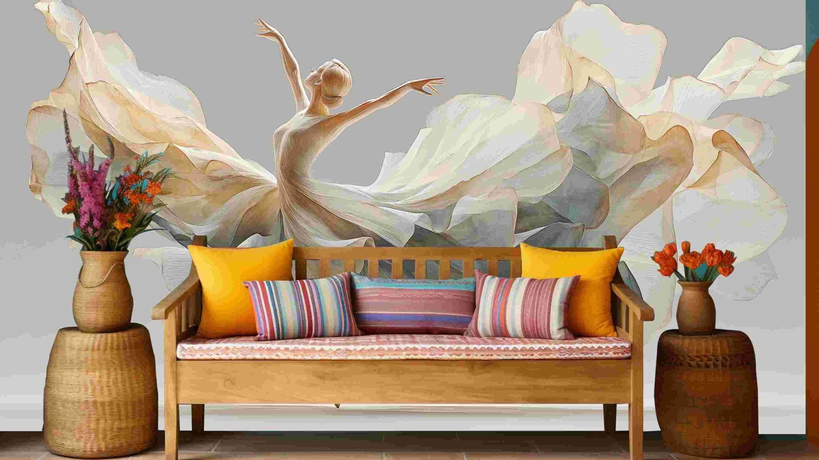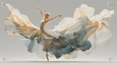 A graceful dancer in mid-pose, surrounded by flowing layers of translucent fabric in soft beige and blue tones.