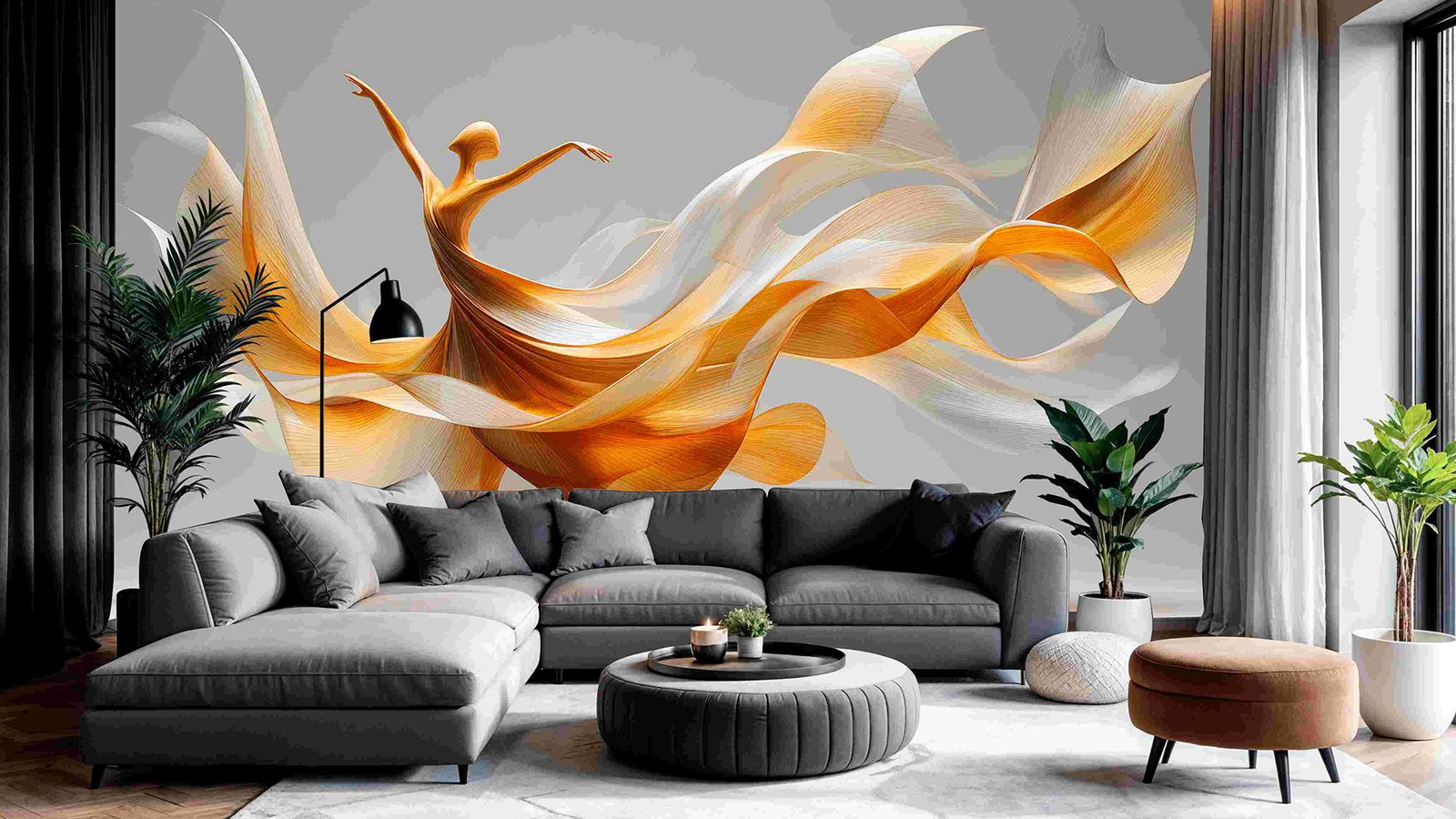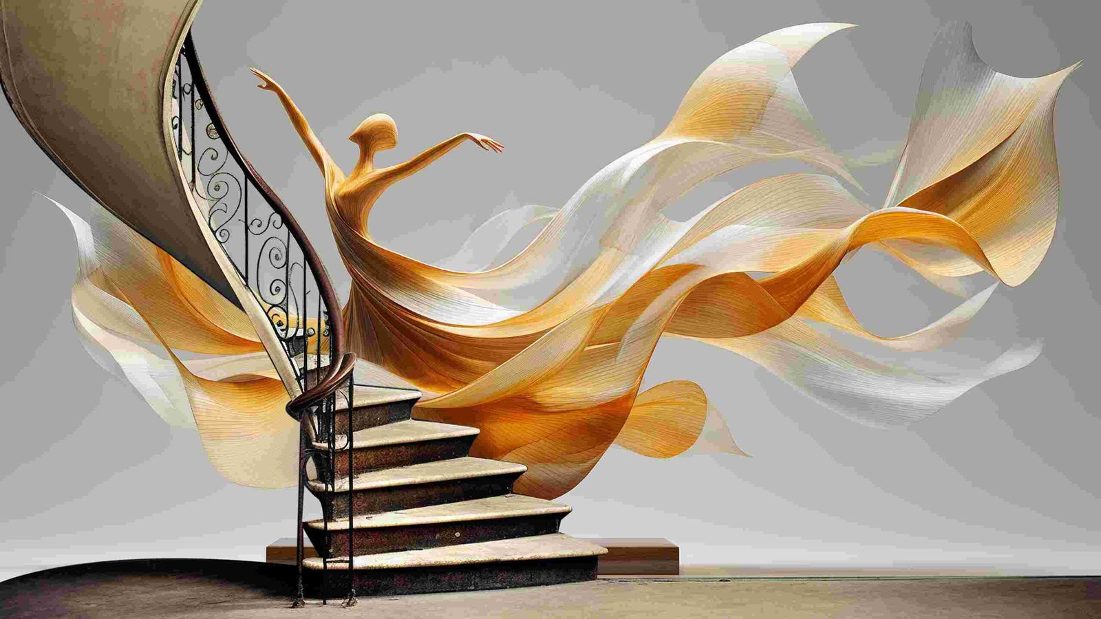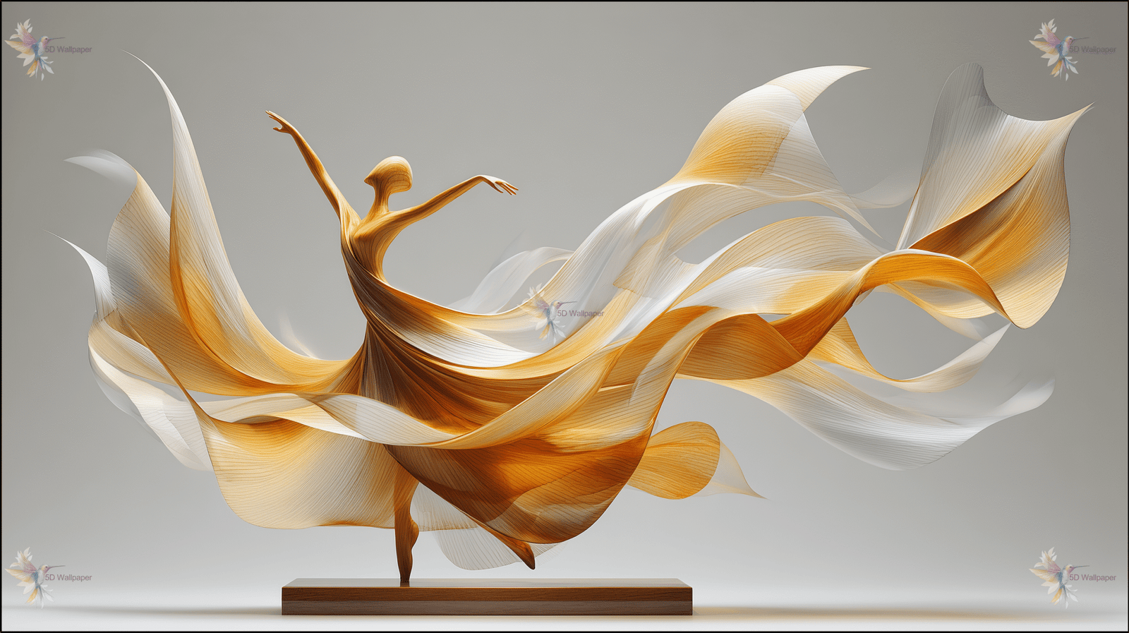 A stylized sculpture of a dancer with flowing golden and white fabric-like elements, posed gracefully.